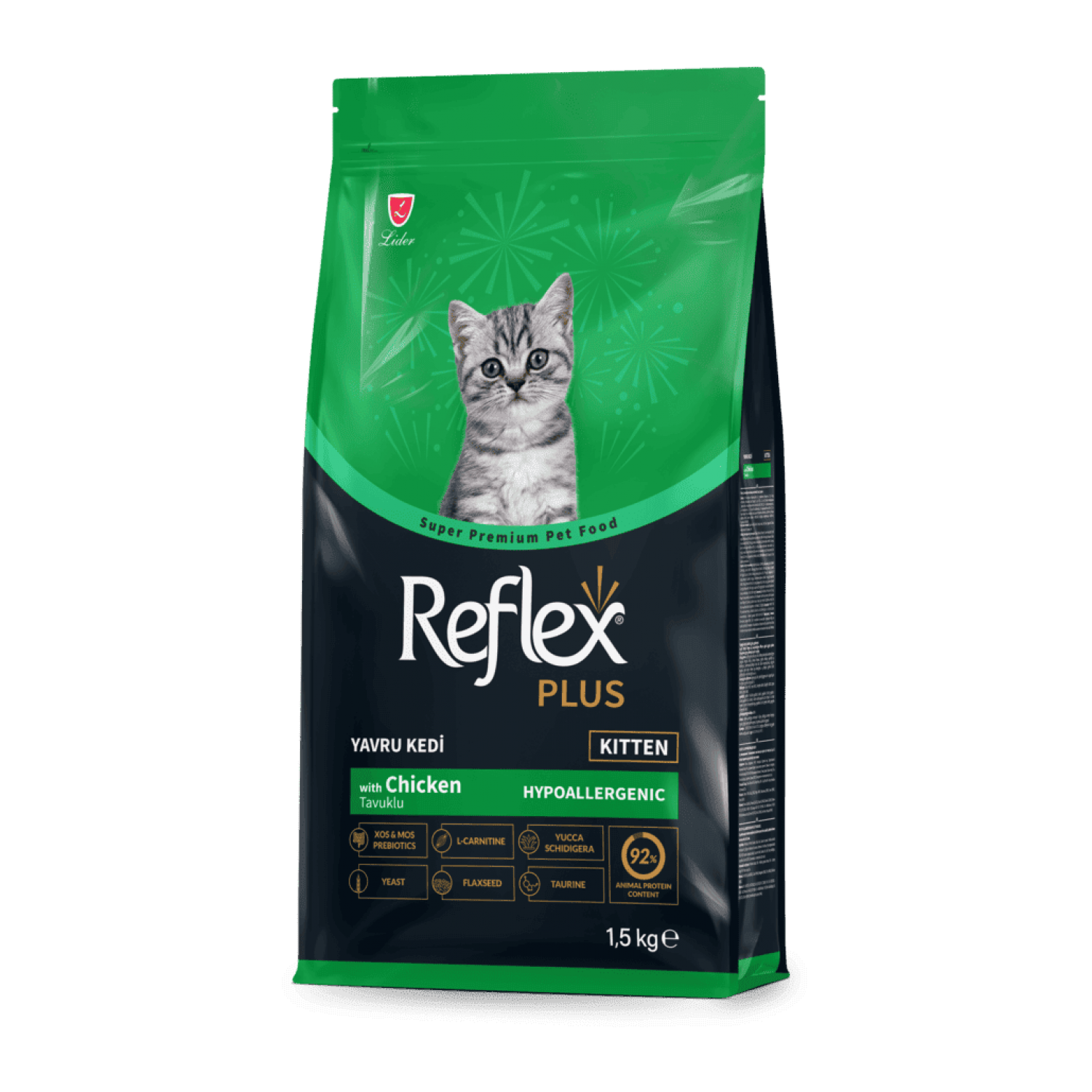 Reflex Plus Kitten для кошенят з куркою - повноцінний і збалансований сухий корм супер-преміум класу, спеціально розроблений для кошенят усіх порід віком від 2 до 12 місяців. Формула з високим вмістом якісного курячого м’яса забезпечує необхідні поживні речовини для здорового росту, розвитку і підтримки імунітету. Reflex Plus підтримує здоров’я травної системи, покращує стан шерсті та сприяє активності вашого улюбленця.