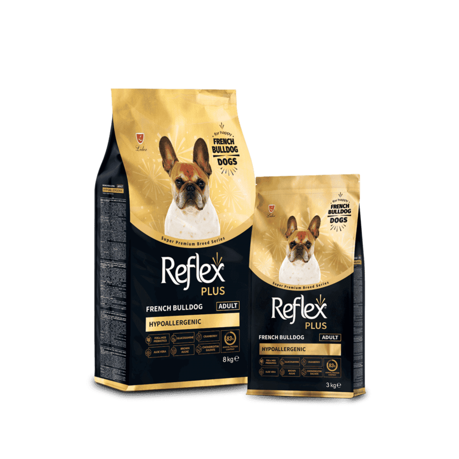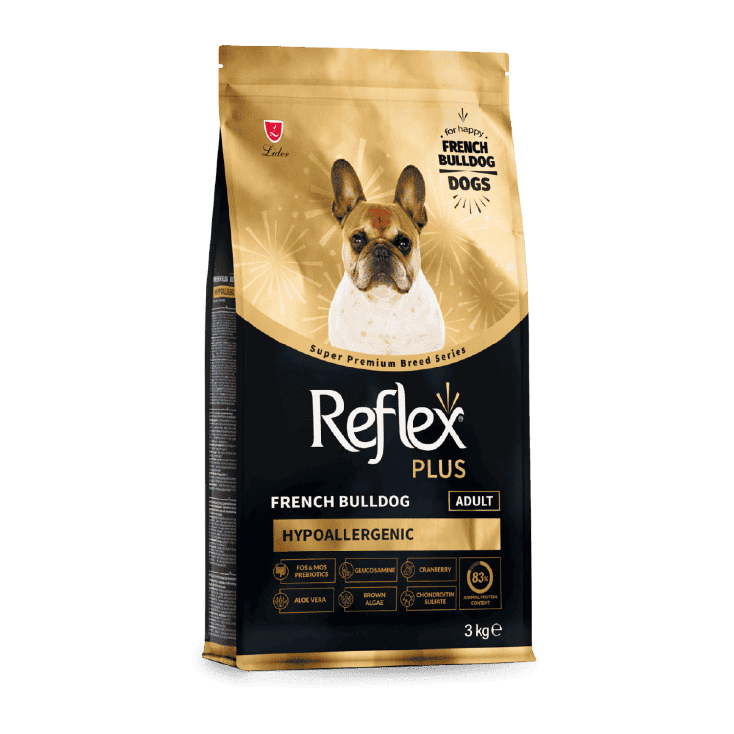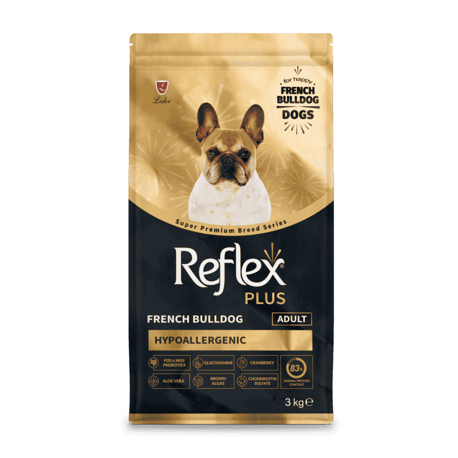 Reflex Plus French Bulldog Adult - це повноцінний та збалансований сухий корм супер-преміум класу, розроблений з урахуванням особливих потреб собак породи французький бульдог віком від 10 місяців. Завдяки спеціальній формулі, збагаченій якісними тваринними білками, вітамінами, мінералами та пребіотиками, корм сприяє підтримці м’язової маси, здоров’я травної системи та імунітету. Омега-3 та омега-6 жирні кислоти покращують стан шкіри та шерсті, а форма і структура гранул адаптовані до анатомічних особливостей щелеп бульдогів, що полегшує жування.