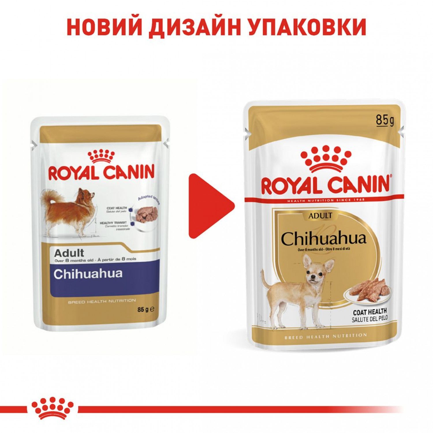 Royal Canin CHIHUAHUA ADULT вологий корм у вигляді паштету для дорослих собак (від 8 місяців) породи чихуахуа. Відмінно збалансований вологий корм насичений амінокислотами, що забезпечують вашому вихованцю чудовий вигляд блискучої та здорової вовни.