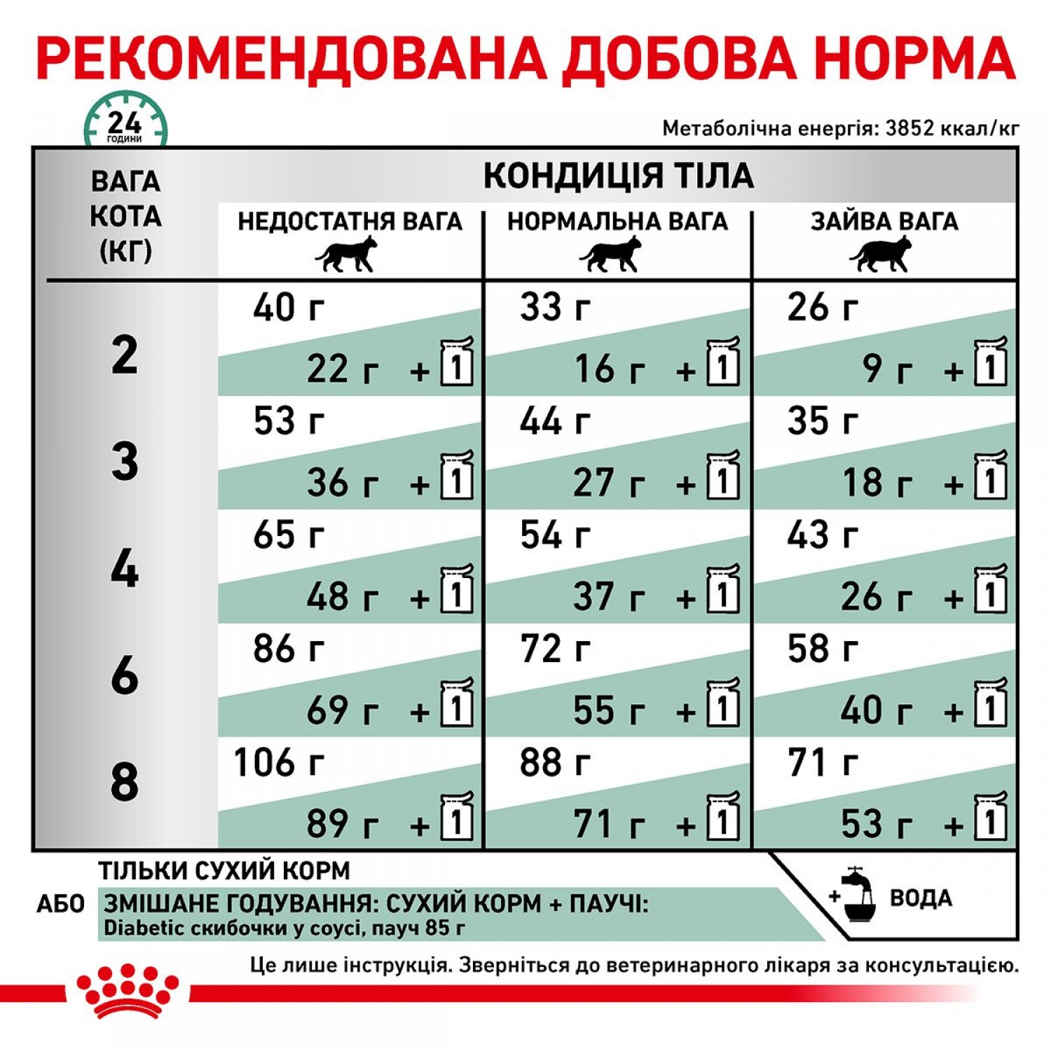 Виробник наполегливо рекомендує звернутися до ветеринарного лікаря за консультацією для початку або продовження застосування ветеринарної дієти.