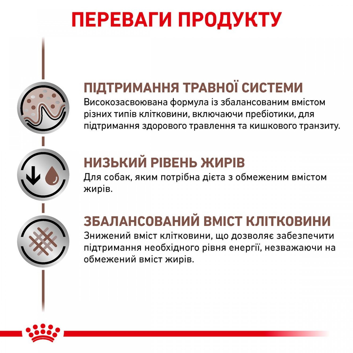 Дієтичний знежирений вологий корм для дорослих собак при розладах травлення. Відзначається низьким рівнем вмісту жирів, що дозволяє налагодити роботу кишково-шлункового тракту та відновити здорову мікрофлору. Розроблений на основі клітковини, яка не перевантажує травну систему та сприяє її відновленню. Вона дозволяє підтримувати необхідний рівень енергії при дотриманні низькожировмістного раціону. Рекомендується при захворюваннях підшлункової залози.