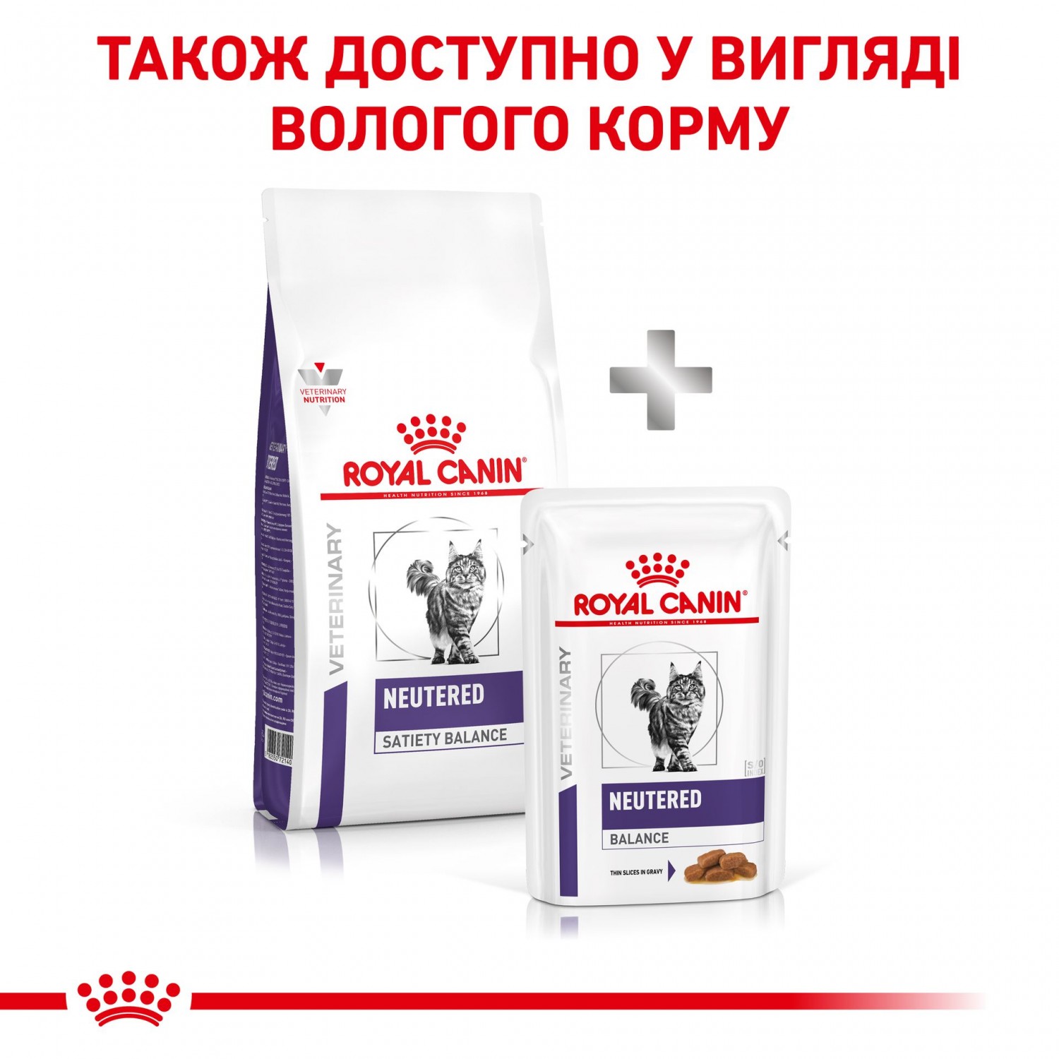 Корм Neutered Satiety Balance від виробника Royal Canin — це спеціальна ветеринарна дієта, розроблена для котів молодших 7 років, які були кастровані чи стерилізовані та мають схильність до зайвої ваги. Корм використовують в якості профілактичної дієти для запобігання сечокам'яної хвороби.