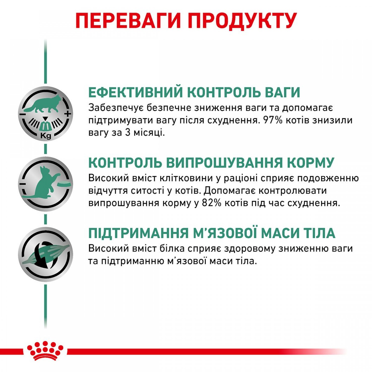 Вологий корм-дієта для дорослих котів, які страждають від надмірної ваги. Допомагає задовольнити апетит тварини й водночас підтримати в нього відчуття ситості, що призводить до зниження частоти випрошування їжі та запуску процесу схуднення.