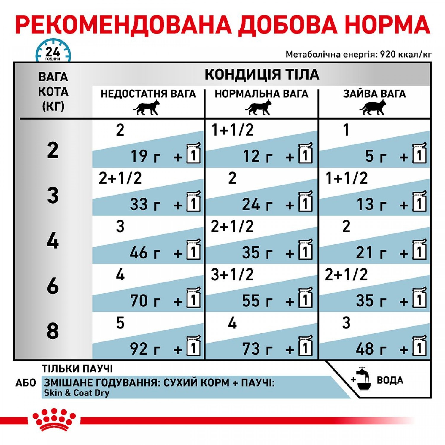 Давати щодня з розрахунку ваги та фізичного навантаження улюбленця. Дотримуйтеся норм годування, зазначених у таблиці на упаковці, але враховуйте індивідуальні потреби тварини. Добова норма має бути підібрана в такий спосіб, щоби зберегти оптимальну вагу кота