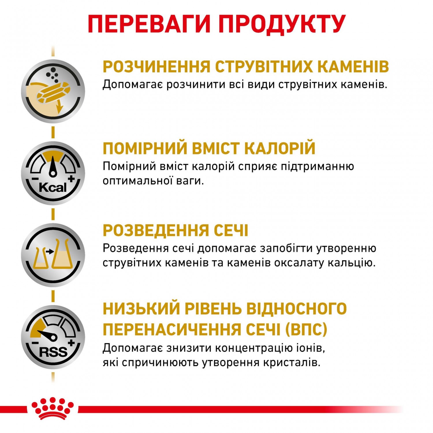 Це повноцінна дієта для дорослих собак, яка має відрегульований вміст енергії та підходить для тварин, що борються з проблемами ваги. Склад корму спеціально розроблений для прискорення розкладання сечових каменів та протидії утворенню нових кристалів та каміння. Він має низький вміст магнію, помірний вміст високоякісних білків і, таким чином, може чинити підкислювальну та розріджувальну дію на сечу. Це може допомогти створити менш сприятливе сечове середовище для утворення кристалів і знизити ризик повторного сечового каміння.