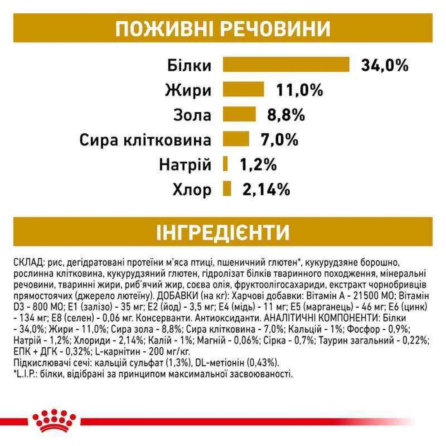 - З контрольованим рівнем магнію, кальцію і фосфору, а також методологією відносного пересичення (RSS) для зниження концентрації іонів у сечі тварини.