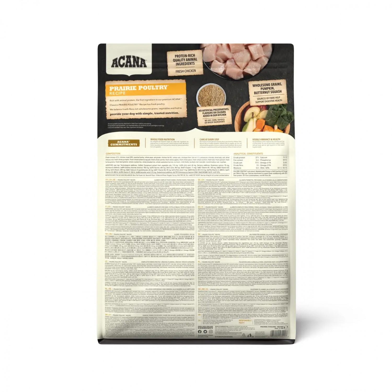 Рацион ACANA Prairie Poultry создан в соответствии с уровнями питательности, установленными FEDIAF для собак всех стадий жизни, включая период роста и собак больших пород. Является отражением природного рациона собак, содержит много высокоусвояемых животных белков и мало ненужных углеводов, что биологически отвечает потребностям любимца в соотношении питательных веществ.