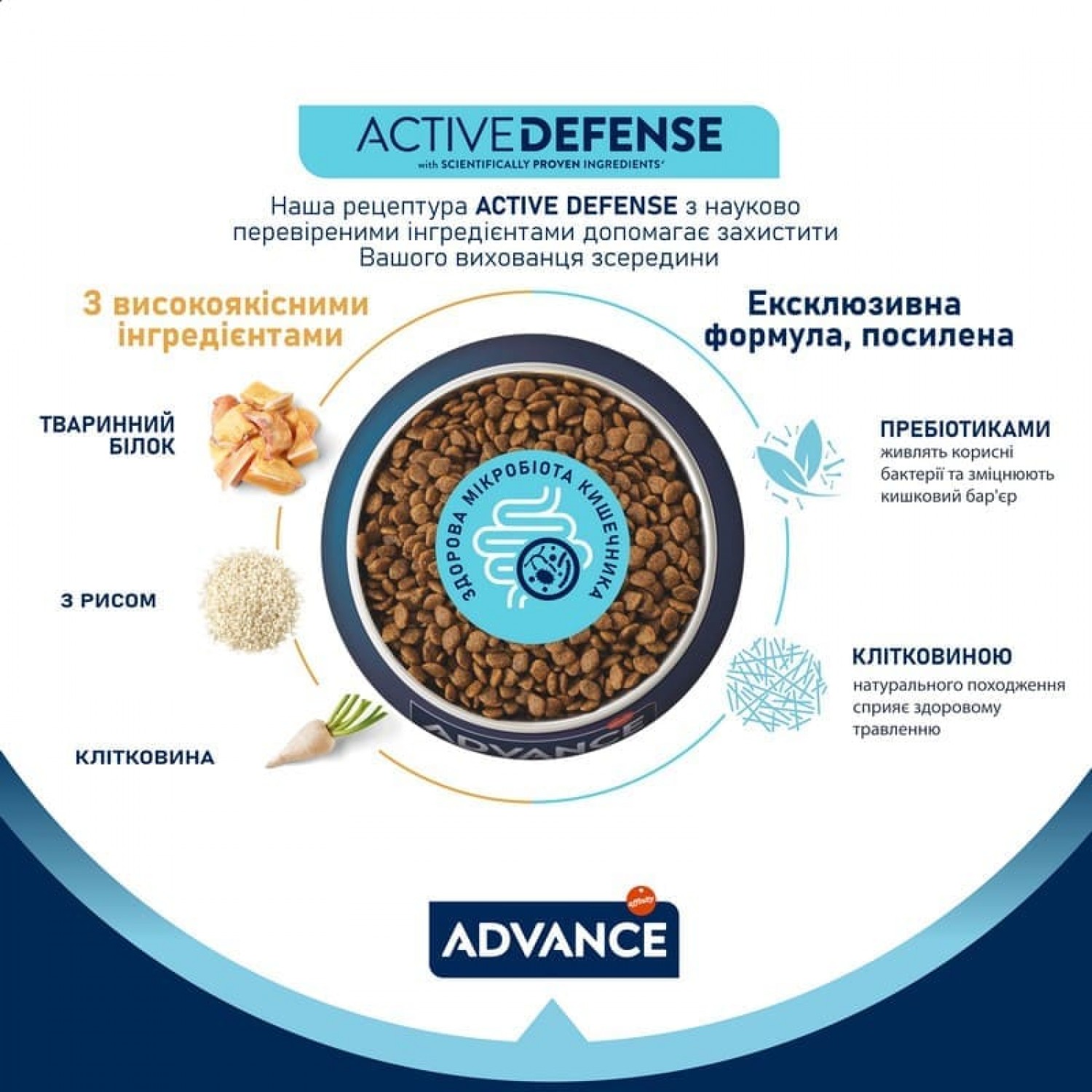 Формула Active Defense в кормах ADVANCE - это научно разработанная система поддержания естественного иммунитета кота. Благодаря сочетанию пробиотиков, пребиотиков, натуральной клетчатки и иммуноглобулинов она способствует здоровому пищеварению, улучшает баланс кишечной микрофлоры и усиливает защитные функции организма. Это помогает вашему любимцу лучше усваивать питательные вещества и противостоять внешним факторам, обеспечивая ему активную и здоровую жизнь каждый день.