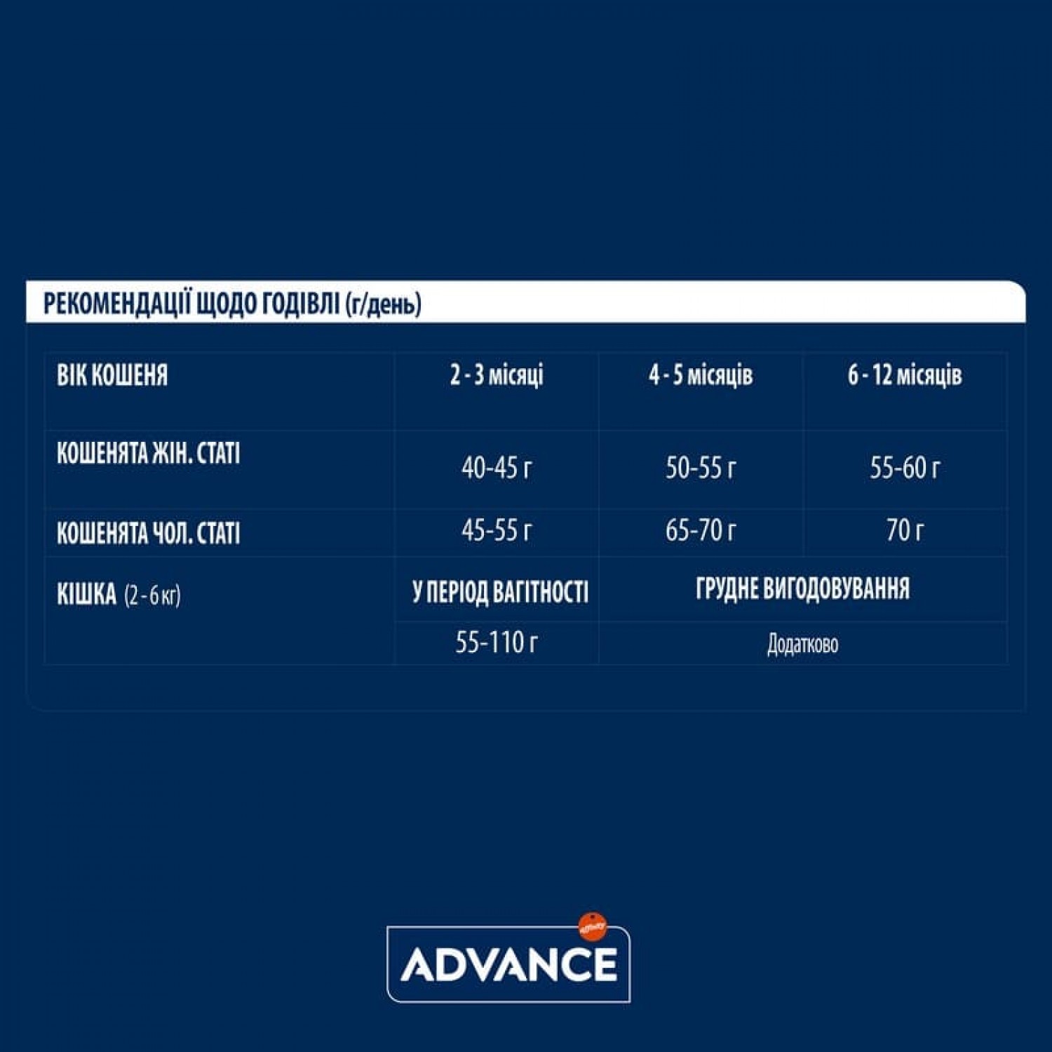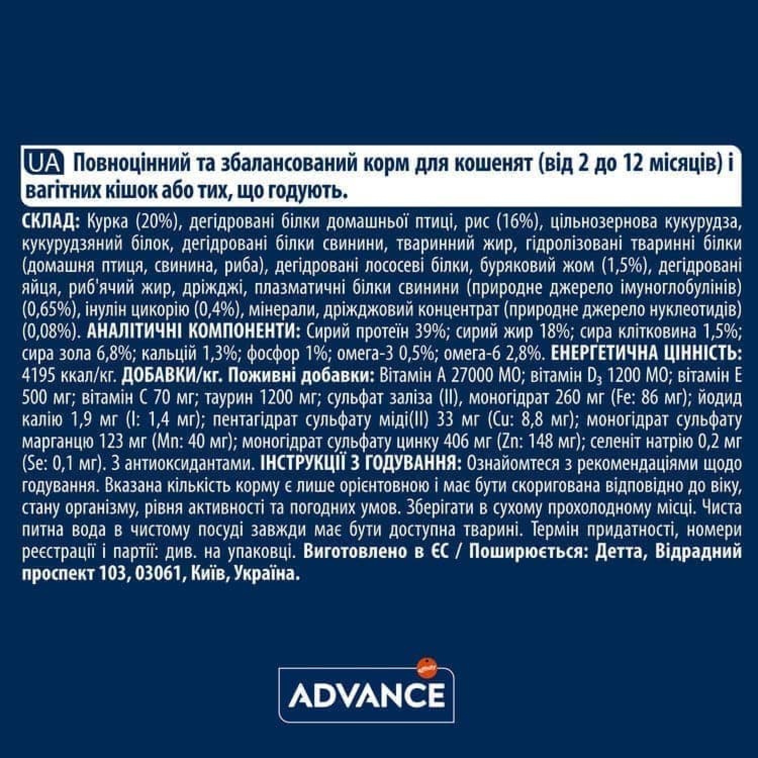 Сухой корм Advance Cat Kitten - это полнорационное и сбалансированное питание, созданное с учетом особых потребностей котят в возрасте от 2 до 12 месяцев. Его тщательно подобранная формула не только способствует гармоничному физическому развитию, но и поддерживает здоровье на клеточном уровне. Благодаря оптимальному составу корм удовлетворяет повышенные требования организма в период активного роста, а также идеально подходит для беременных и кормящих кошек, снабжая их необходимыми питательными веществами для сохранения здоровья и благополучия.