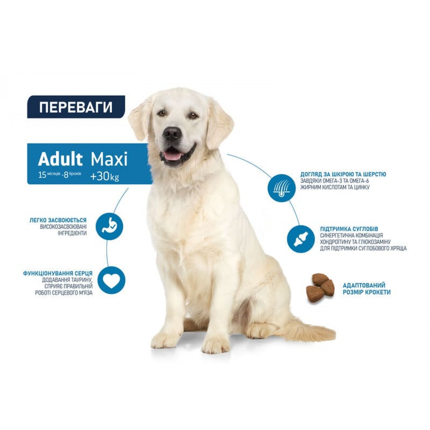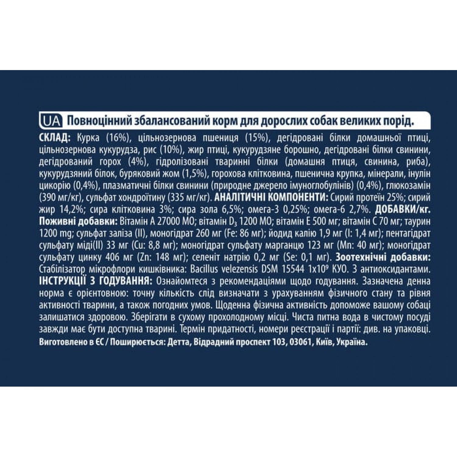 - Оптимальный уровень протеинов и жиров – полностью удовлетворяет энергетические потребности взрослых собак больших пород.