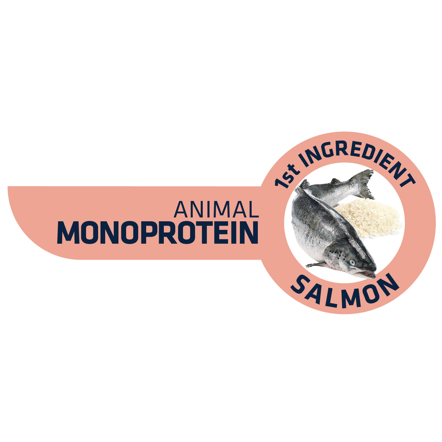 - Изготовлен исключительно на основе лосося, который является легкоусвояемым источником белка, идеальным для щенков и взрослых собак с непереносимостью других видов белка.