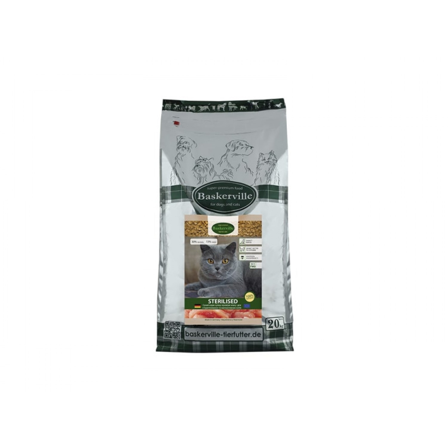 Сухой корм супер-премиум класса для стерилизованных и малоактивных котов Baskerville (Баскервиль). Стерилизованные коты имеют много физиологических и поведенческих отличий от обычных. Их организм приобретает изменения со стороны гормональной, мочегонной систем, замедляется обмен веществ, повышается аппетит одновременно со снижением подвижности. Учитывая эти особенности, был создан сухой корм для стерилизованных котов премиум-класса корм Baskerville Sterilised, который призван снизить риски (ожирение, мочекаменная болезнь, диабет, артроз и др.). В состав корма входят все необходимые питательные вещества, витамины и микроэлементы для малоподвижных кошек. Обязательно придерживайтесь таблицы кормления.