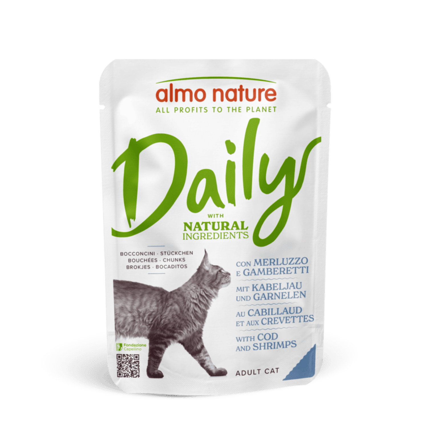 Almo Nature Daily Cat с треской и креветкамии в соусе - это беззерновой влажный корм суперпремиум-класса, созданный для ежедневного кормления взрослых кошек, которые заслуживают лучшего.