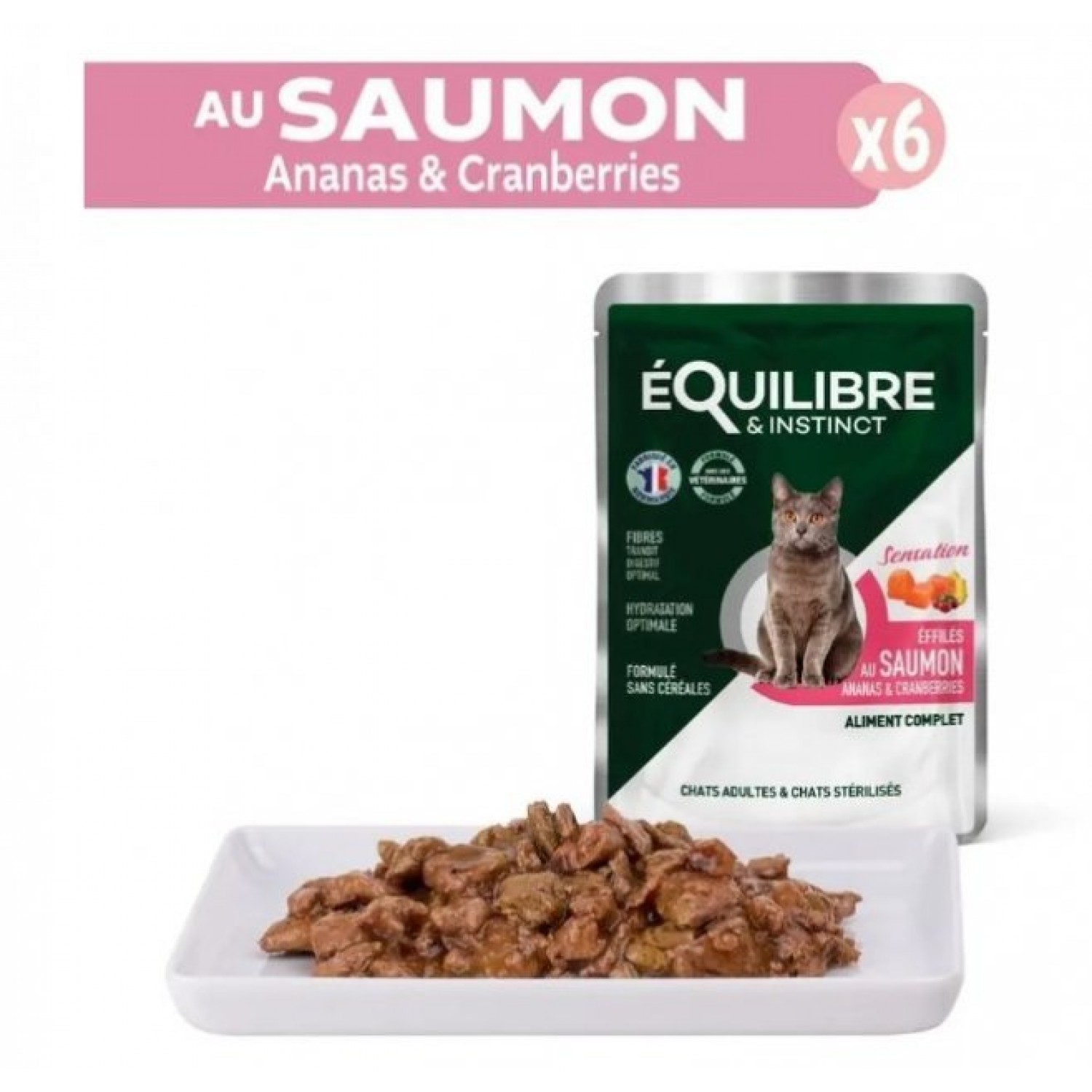 - Кусочки в соусе Equilibre & Instinct для взрослых кошек с лососем, ананасом и клюквой.