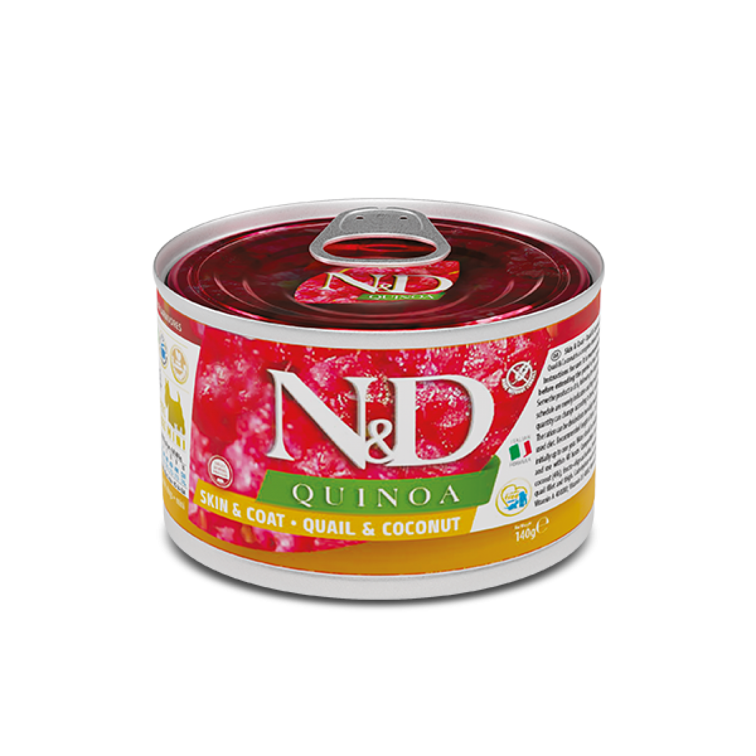 Farmina N&D Quinoa Skin & Coat Quail & Coconut Adult Mini - это сбалансированный беззерновой влажный корм с перепелом и кокосом для взрослых собак миниатюрных и малых пород, склонных к пищевой аллергии. Невероятно аппетитное и питательное угощение, которое может использоваться как самостоятельно, так и для дополнения основного рациона.