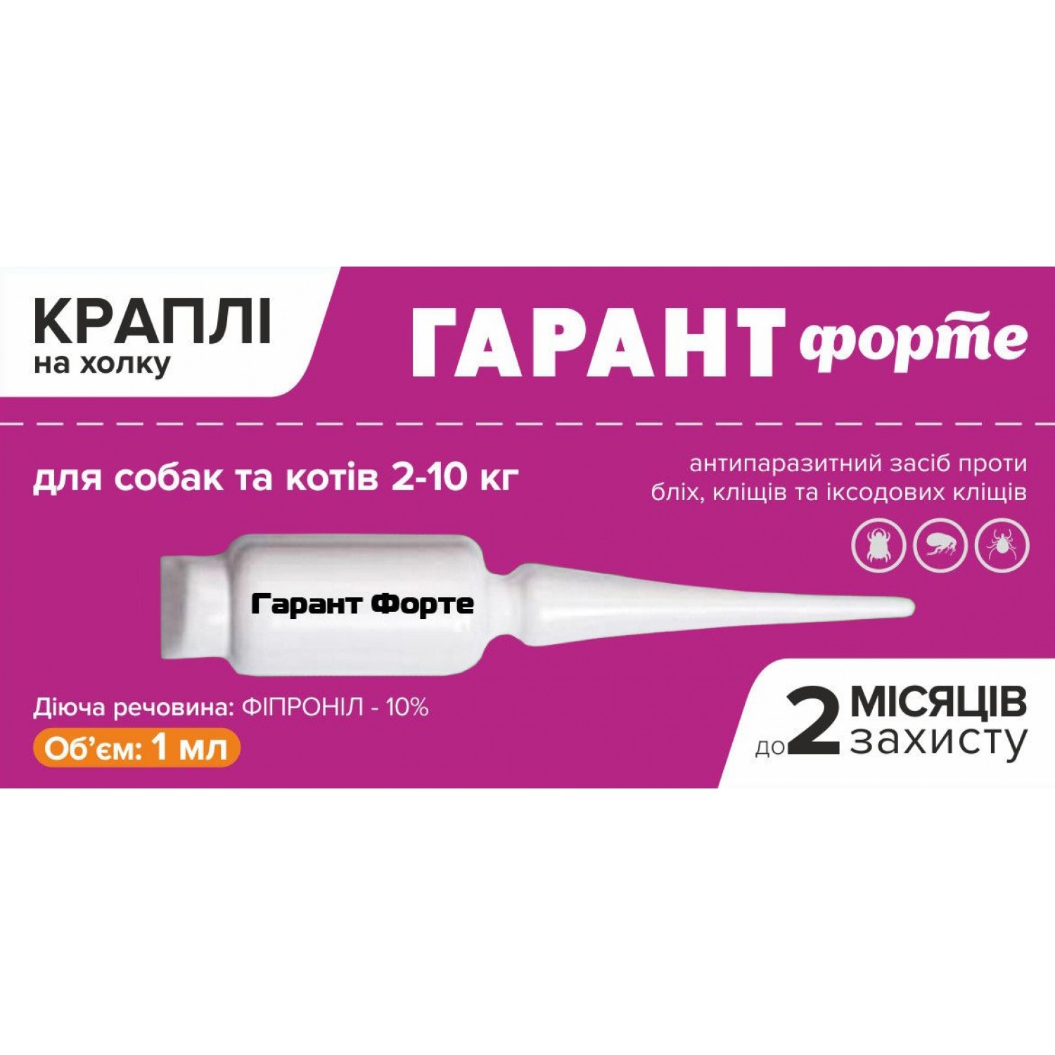 - Капли ГАРАНТ форте активны по отношению к иксодовым клещам, хейлителям, отодектосам, так же они направлены на уничтожение вшей, блох и волосоедов.