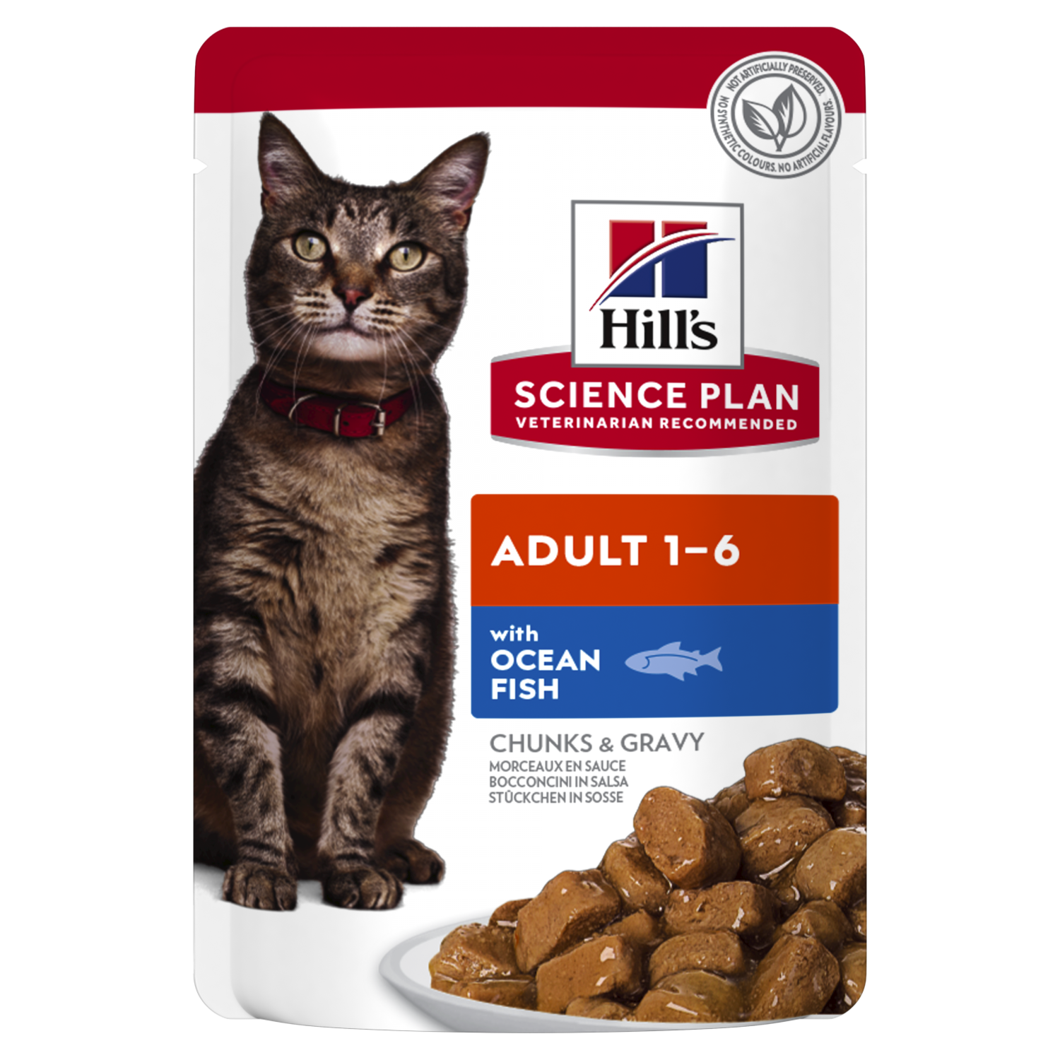 Влажный корм для кошек Hill's Science Plan Adult (Хиллс Сайнс План Эдалт) с океанической рыбой - вкусные кусочки в соусе, тщательно сбалансированное питание для взрослых кошек. Изготовлен из высококачественных и легкоусвояемых ингредиентов и специально разработан для удовлетворения потребностей в энергии кошек именно в расцвете сил. Взрослый кот нуждается в питании, которое будет способствовать здоровому пищеварению. Питание для кошек Hill's сделано из ингредиентов высочайшего качества. Эти ингредиенты должны отвечать строгим требованиям Hill's Pet Nutrition по чистоте и содержанию питательных веществ, превосходящих отраслевые стандарты. Влажный корм Hill's Science Plan Adult рекомендован для кошек от 1 до 6 лет.