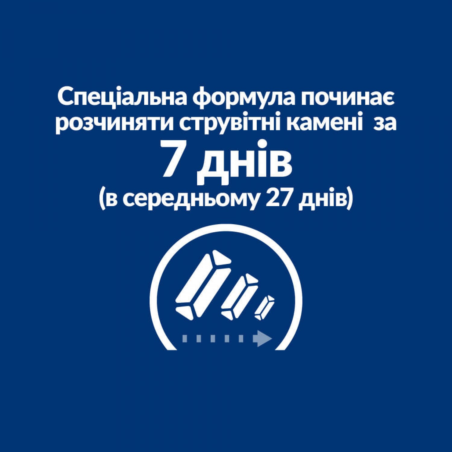- Специальная формула начинает растворять струвитные камни уже через 7 дней потребления корма (средний срок растворения составляет 27 дней)2.