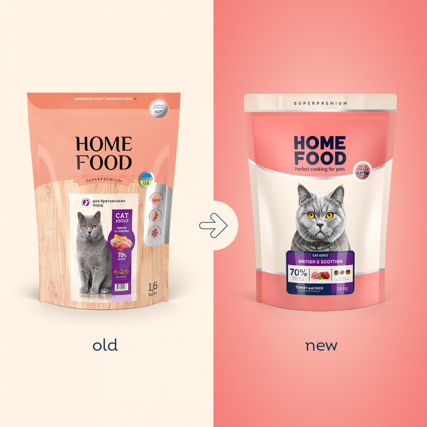 Home Food Cat Adult "Индейка и утка" - сухой корм для кошек британских и шотландских пород. Форма гранул корма специально разработана с учетом физиологических особенностей челюстного аппарата кошек британских и шотландских пород. Подходит также пушистикам больших пород.