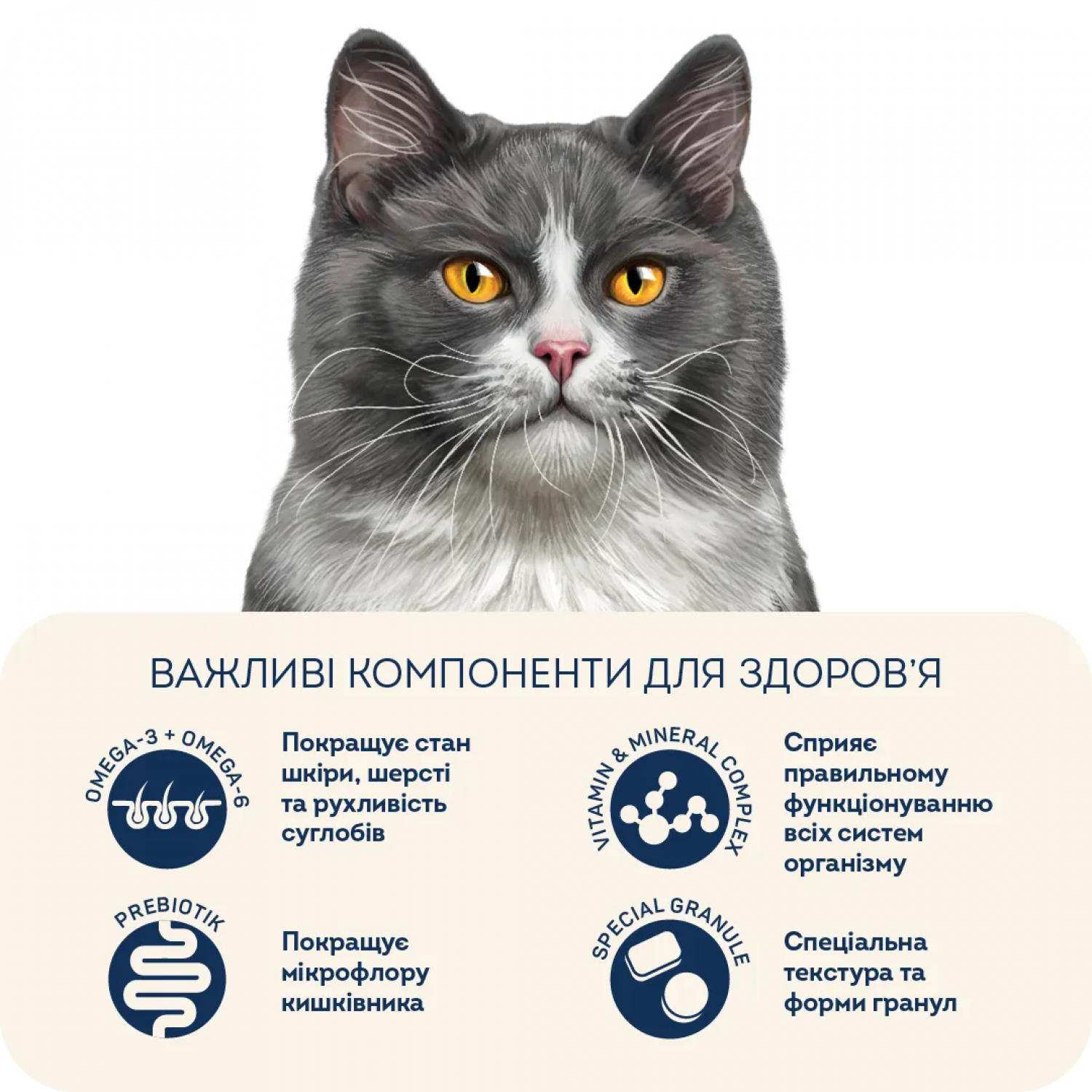 • Сочетание двух различных форм гранул, покрытых различными оболочками (масло Лосося и мясной топпинг), дарят насыщенный аромат корма, который так нравится привередливым котикам.