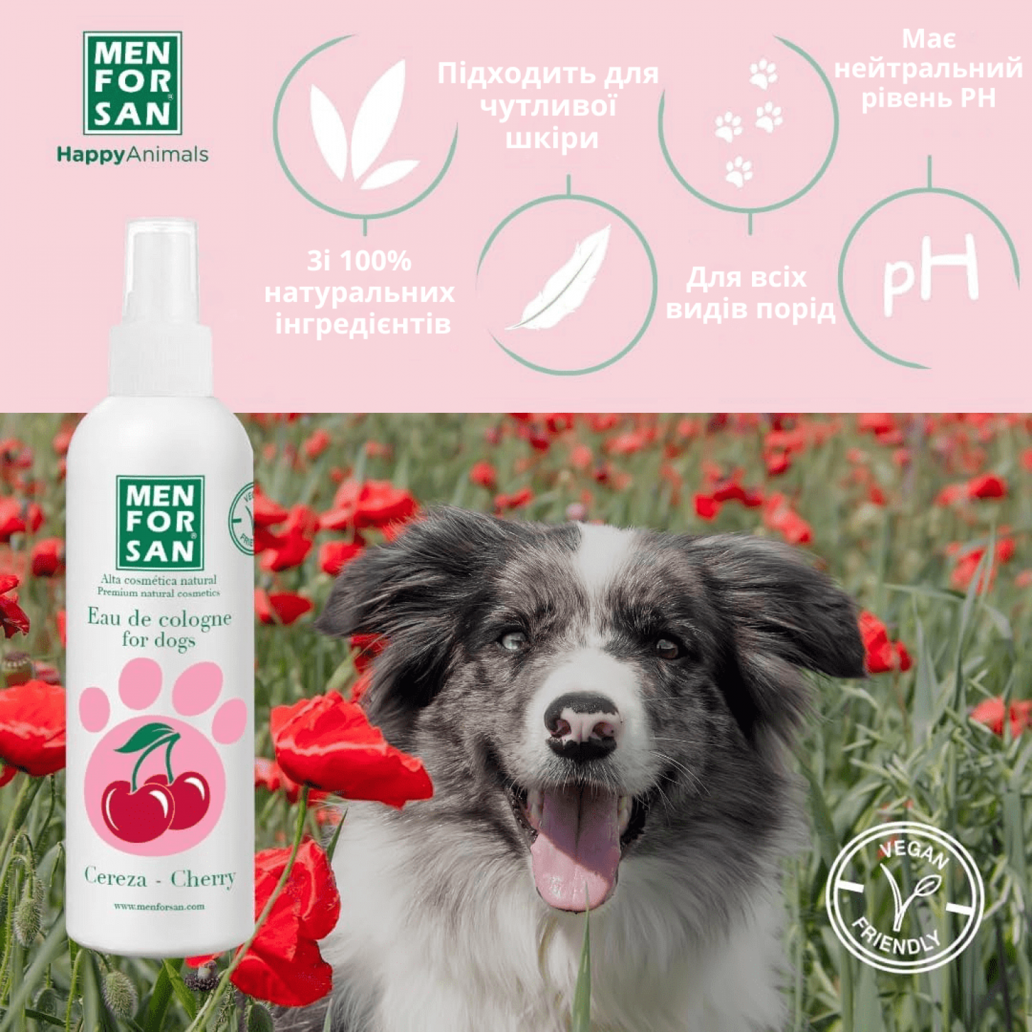 Натуральный одеколон для собак с ароматом ВИШНИ, создан специально для свежего аромата после купания и очень приятного интенсивного дезодорирующего эффекта. Аромат создан из веганских ингредиентов, которые бережно относятся к коже и не изменяют обонятельных свойств животного.