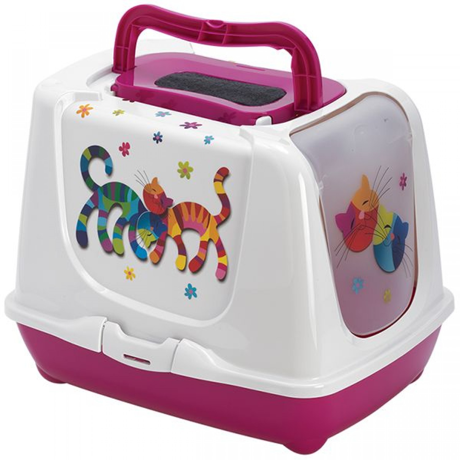 Если ваш питомец любит активно закапывать и разбрасывать наполнитель вокруг лотка, тогда домик-туалет для кошек МОДЕРНА ТРЕНДИ КЕТ станет для вас идеальным решением. К основным плюсам модели можно отнести более эстетичный вид, чем у открытого лотка, а также отсутствие неприятного запаха. Это позволяет размещать кошачий туалет в любом месте квартиры, при этом стильный дизайн Friends Forever с яркими разноцветными кошками-друзьями отлично впишется в любой современный интерьер. Закрытый туалет можно использовать для подросших котят и взрослых животных. Он достаточно просторный и высокий, чтобы вашему питомцу было в нем комфортно.