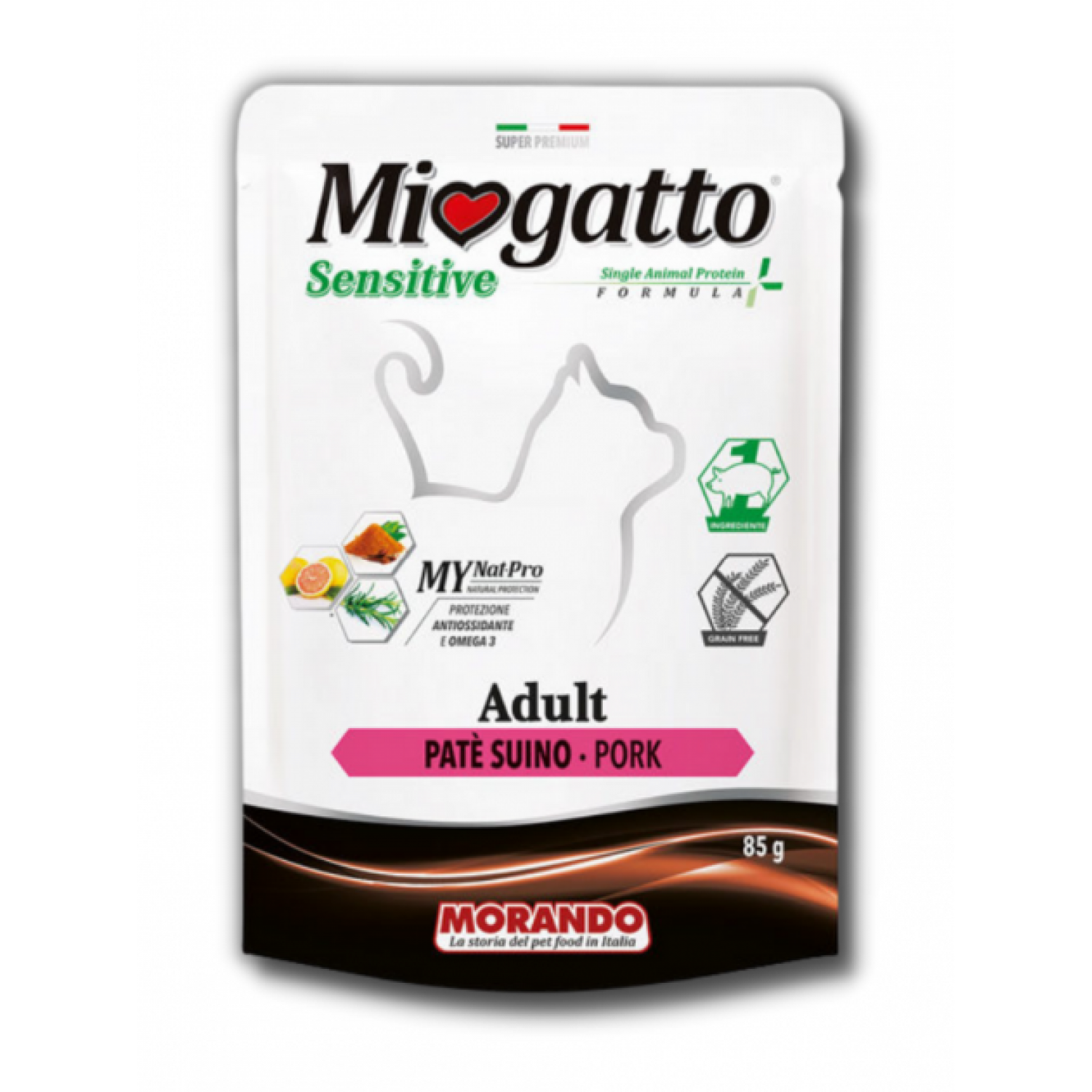 - Miogatto Sensitive не содержит никаких искусственных консервантов, ароматизаторов и красителей, имеет натуральный и очень привлекательный вкус и консистенцию.