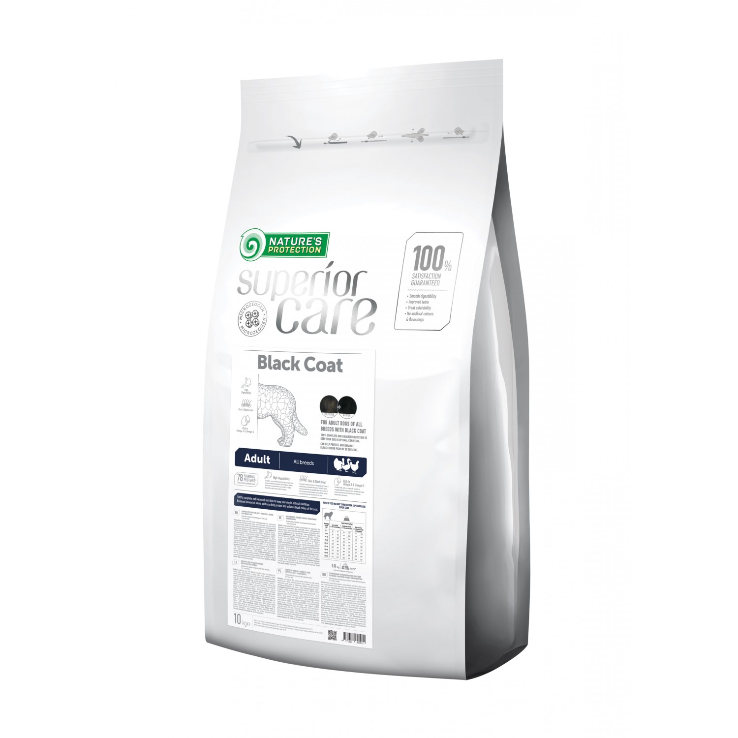 Nature's Protection Superior Care Black Coat Adult All Breeds сухой корм для взрослых собак всех пород с черным окрасом шерсти - один из супер-премиум кормов для собак. С мясом домашней птицы, подходит в качестве ежедневного основного питания для взрослых собак. Имеет сбалансированный и питательный состав, удовлетворяющий все потребности взрослой собаки и обеспечивающий ее активность. Основной источник протеина -мясо домашней птицы. Корм идеально подходит для питомцев с черной шерстью. Компоненты в его составе улучшают ее качество, делают окрас более насыщенным и блестящим. Также в составе содержится специальный компонент - MicroZeoGen, который помогает вывести из организма питомца накопленные токсины.