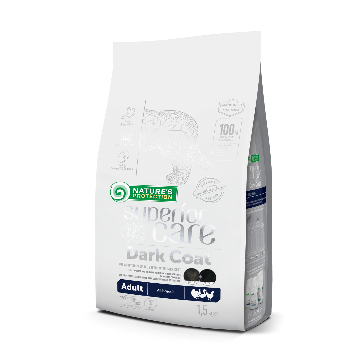 Nature's Protection Superior Care Dark Coat - полнорационный сухой корм с птицей, который полностью удовлетворяет потребности организма взрослой собаки в питательных веществах, положительно влияет на общее здоровье питомца, легко усваивается и имеет приятный для животного вкус. Рацион изготовлен по уникальной формуле, что помогает сохранить насыщенный темный цвет шерсти.