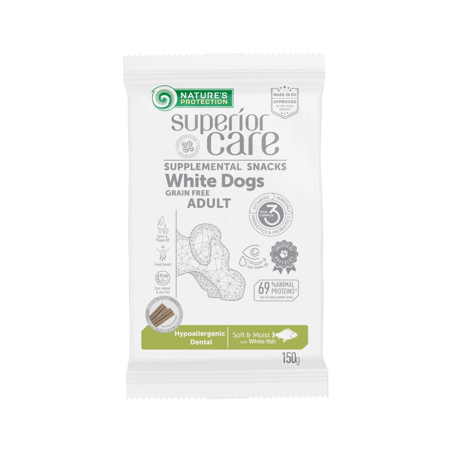 Nature's Protection Superior Care White Dogs Hypoallergenic & Dental Care лакомство с белой рыбой для собак с белым окрасом.