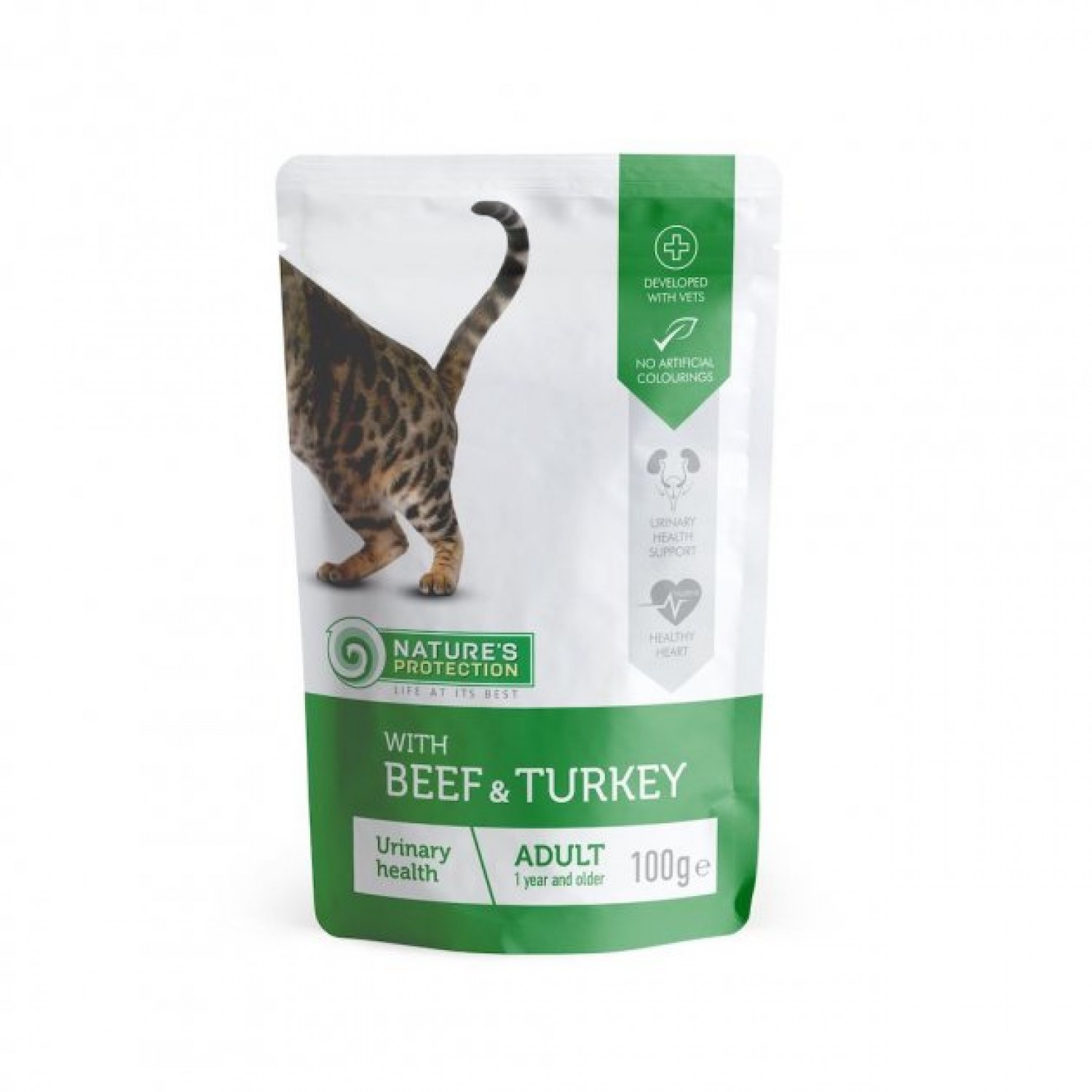 Влажный корм Nature's Protection Urinary with Beef and Turkey для кошек с говядиной и индейкой - отличный выбор для ухода за кошками с проблемами мочевыводящих путей. Корм может помочь избавиться от струвитных камней.