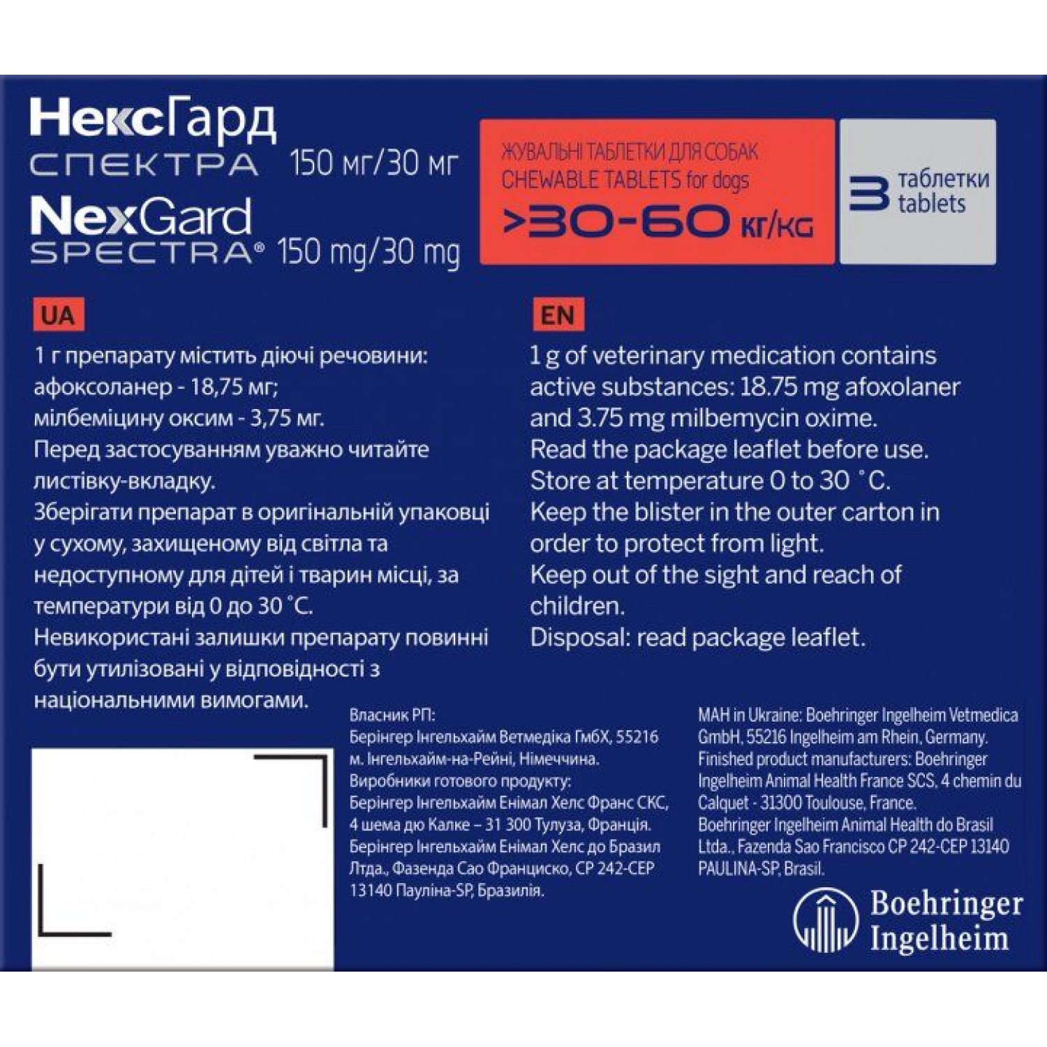 Комбинированный противопаразитарный препарат в виде жевательных таблеток со вкусом говядины для собак, весом от 30 до 60 кг. Защищает питомца от блох, иксодовых и кожных клещей, желудочно-кишечных нематод и личинок дирофилярий на срок до 1 месяца.