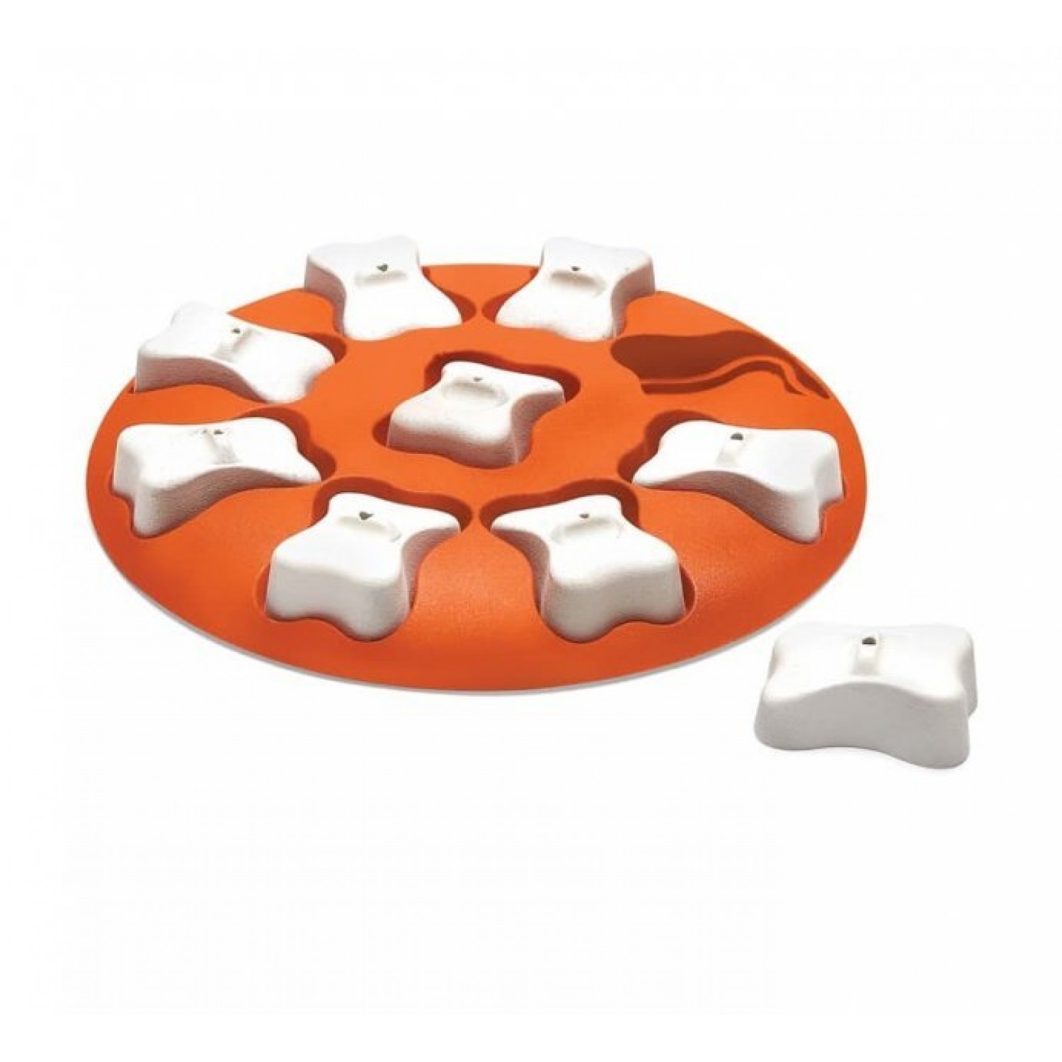 - Поместите лакомство или гранулы сухого корма в выемки на основной панели игрушки и накройте косточками. Чем больше тайников вы накроете, тем сложнее будет игра для питомца.