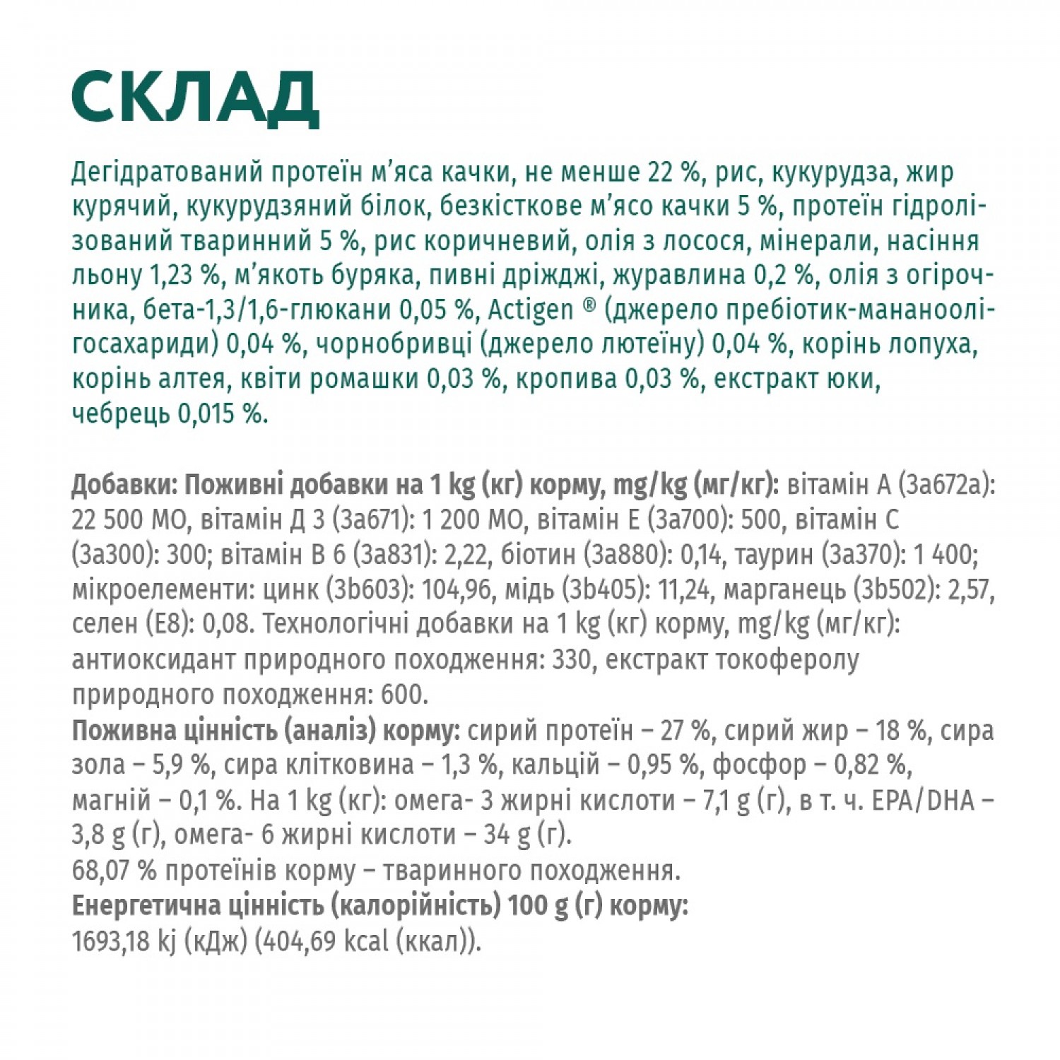Состав: дегидратированный протеин утки, не менее 22 %, рис, кукуруза, куриный жир, кукурузный белок, бескостное мясо утки 5 %, протеин гидролизованный животный 5 %, рис коричневый, масло лосося, минералы, cемена льна 1,23 %, мякоть свеклы, пивные дрожжи, клюква 0,2 %, масло огуречника, бета-1,3/1,6-глюканы 0,05 %, Actigen ® (источник пребиотик - мананоолигосахариды) 0,04 %, бархатцы (источник лютеина) 0,04 %, корень лопуха, корень алтея, цветы ромашки 0,03 %, крапива 0,03 %, экстракт юкки, чабрец 0,015 %.