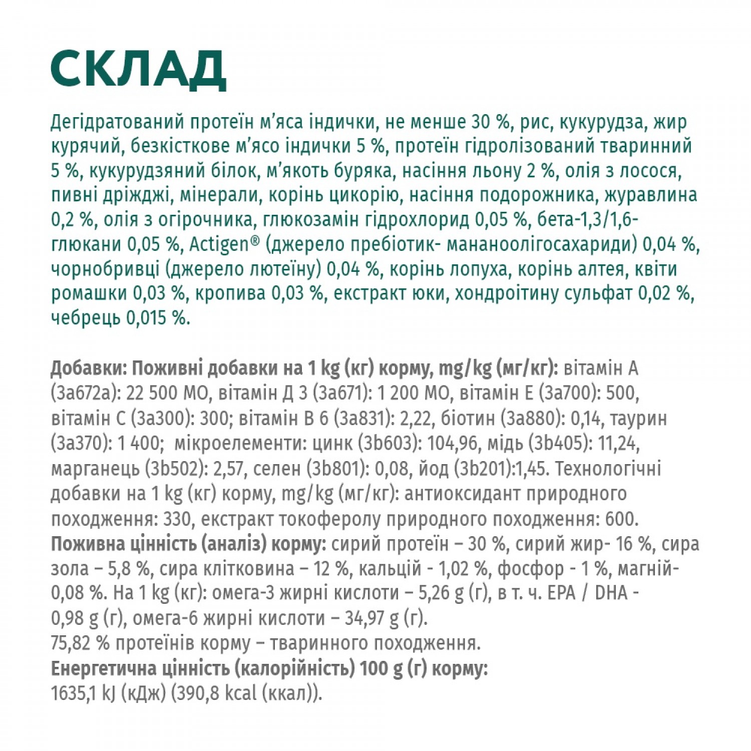 - Содержит 75,82% протеинов животного происхождения.