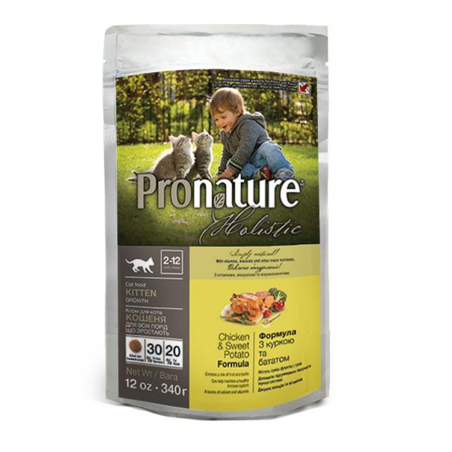 Формула роста для котят Pronature Holistic Kitten Chicken & Sweet Potato PRONATURE HOLISTIC с курицей и сладким картофелем. Сухой холистический корм для котят от 2 до 12 месяцев. Уникальная рецептура делает корм для котят полноценным, вкусным и способствует здоровью и гармоничному развитию организма в целом.