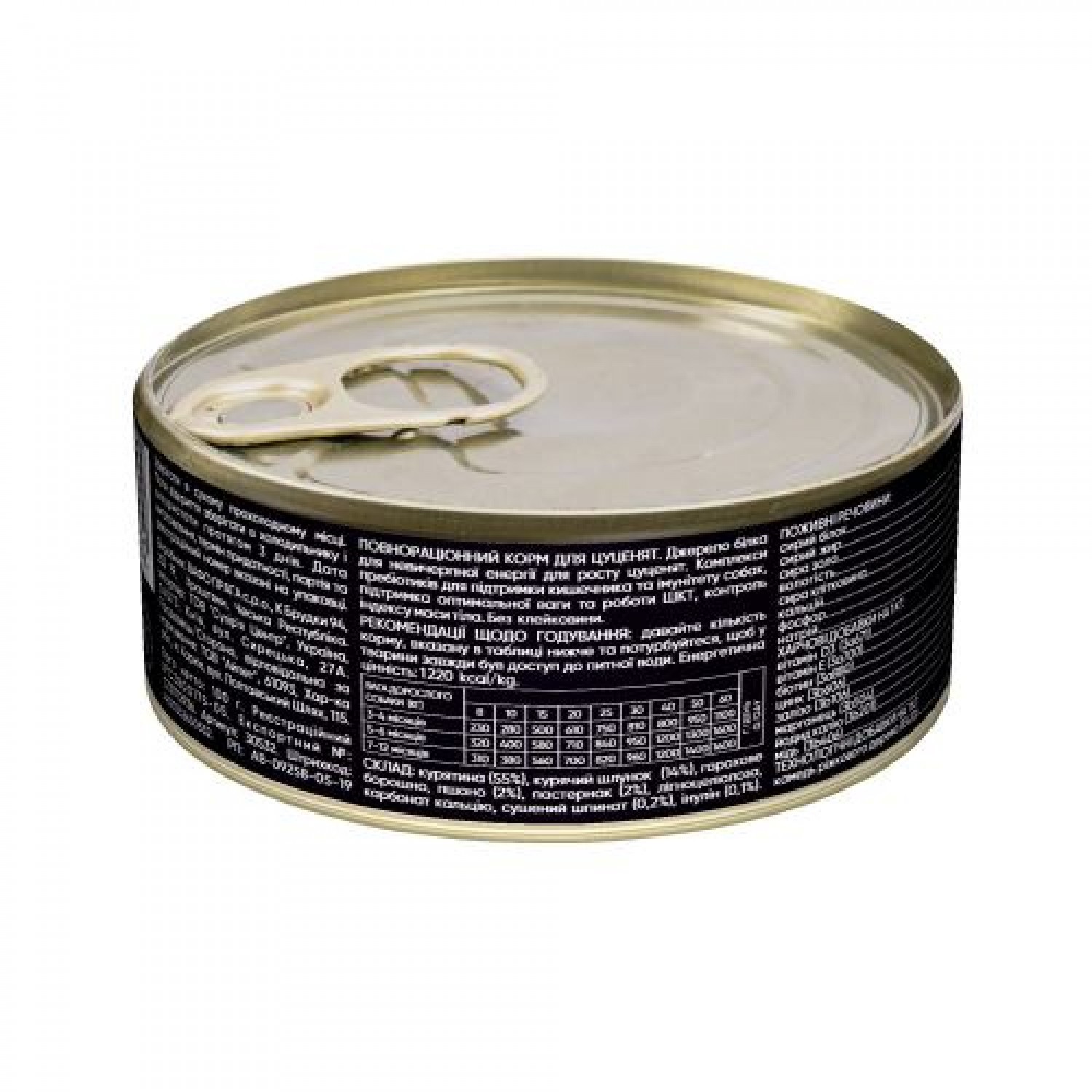 Гарантированный анализ: сырой белок - 10%, сырой жир - 7%, сырая зола - 2%, влажность - 75%, клетчатка - 1%, кальций - 0,4%, фосфор - 0,3%, натрий - 0,5%.