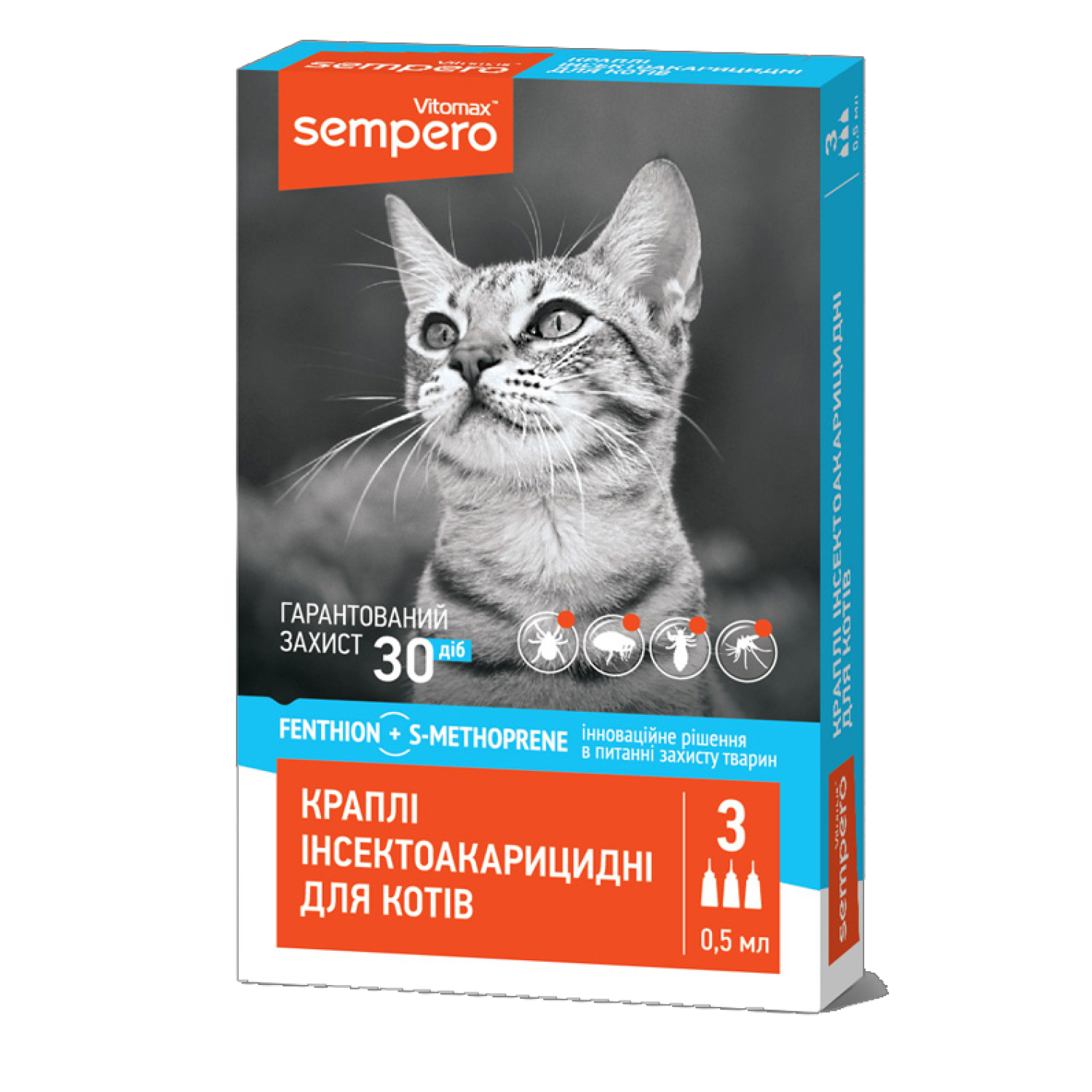 Semperoдля котов–инсектоакарицидные капли нового поколения на основе комбинации действующих веществ Fenthion и S-Methoprene. Гарантированная защита от эктопаразитов на всех стадиях развития.