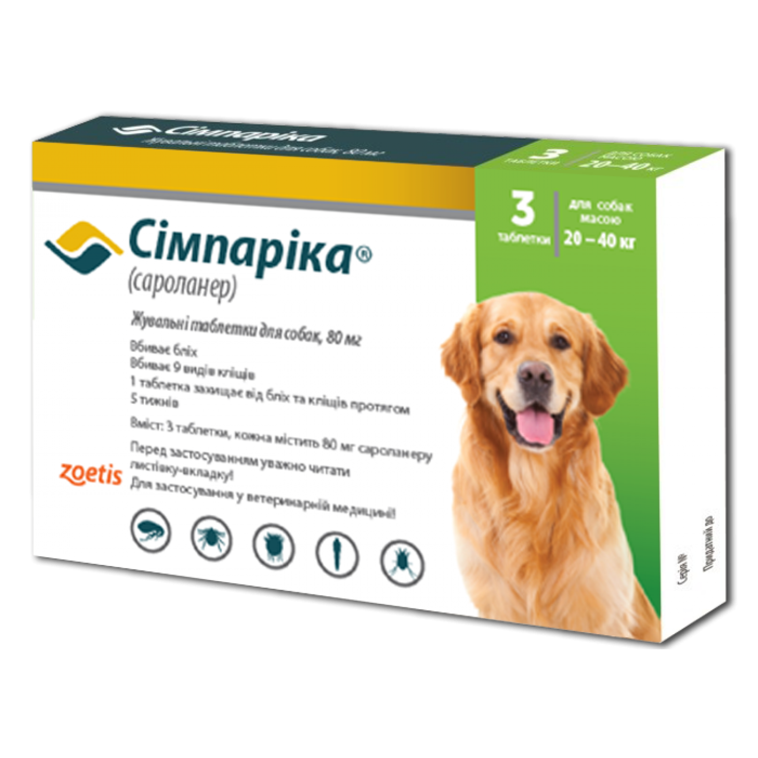 - Доза препарата Симпарика Жевательные таблетки для собак, 80 мг - одна таблетка для собак массой тела 20 - 40 кг.
