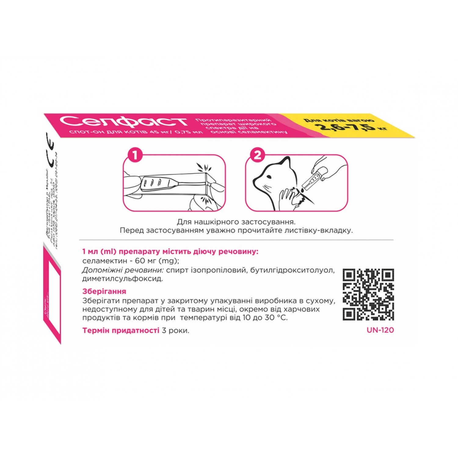 Селфаст Unicum - это противопаразитарное лекарственное средство, предназначенное для кошек. Препарат широкого спектра действия против блох, вшей, гельминтов, волосоидов и клещей на основе селемектина, обладающий широким спектром действия. -токсического или сенсибилизирующего эффекта.
