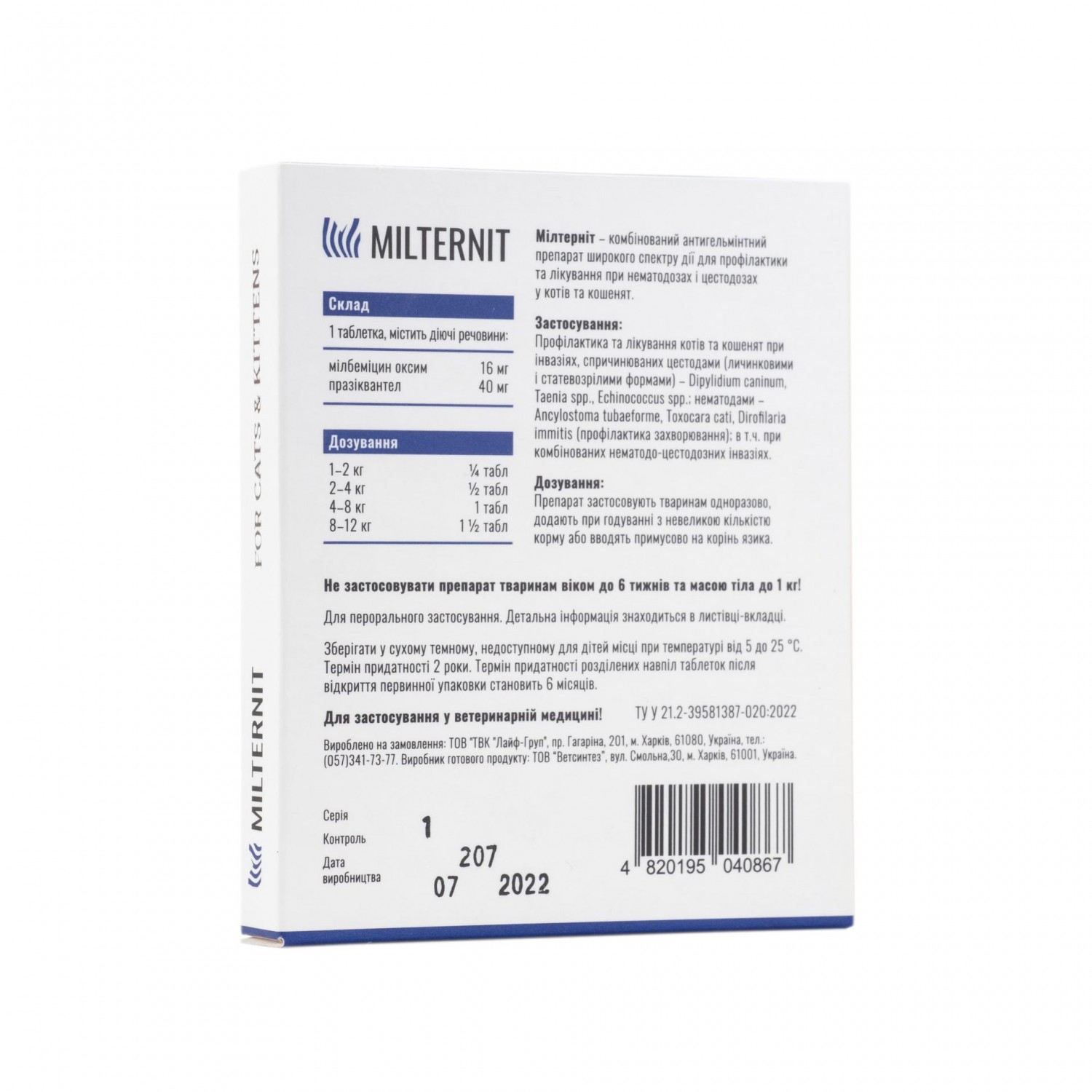 Милтернит — комбинированный антигельминтный препарат широкого спектра действия для профилактики и лечения при нематодозах и цестозах у кошек и котят.