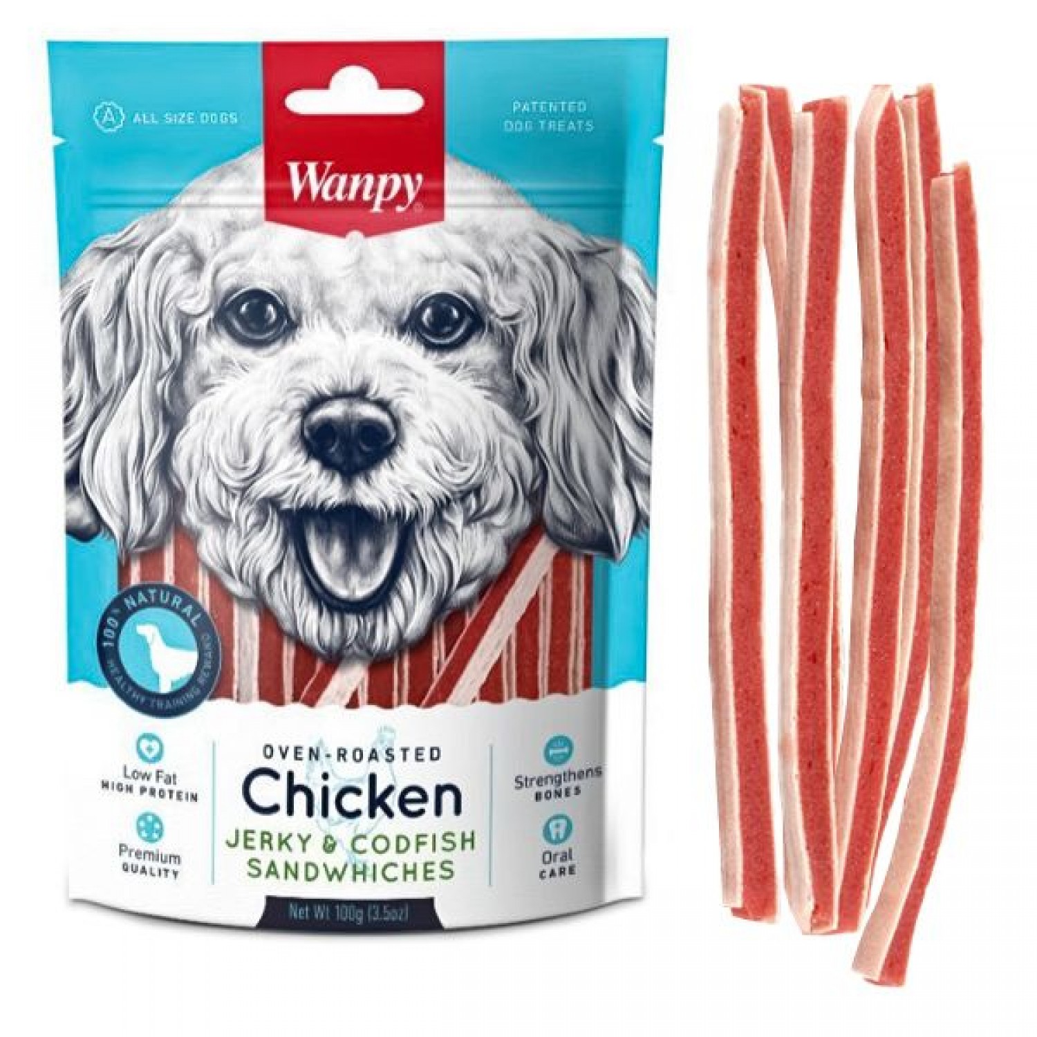Сэндвич-полоски Wanpy Chicken Jerky & Codfish Sandwiches – натуральное лакомство для собак на основе вяленого мяса курицы и филе трески. Предназначены как вкусное и полезное дополнение к основному рациону собак и щенков всех пород от 3-х месяцев.
