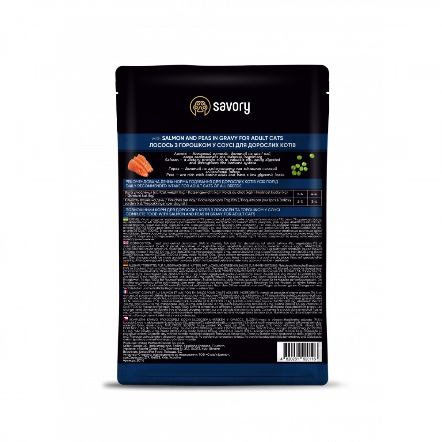 Savory Adult Cat Pouch with Salmon & Peas in Gravy вологий корм для котів з лососем та горошком.