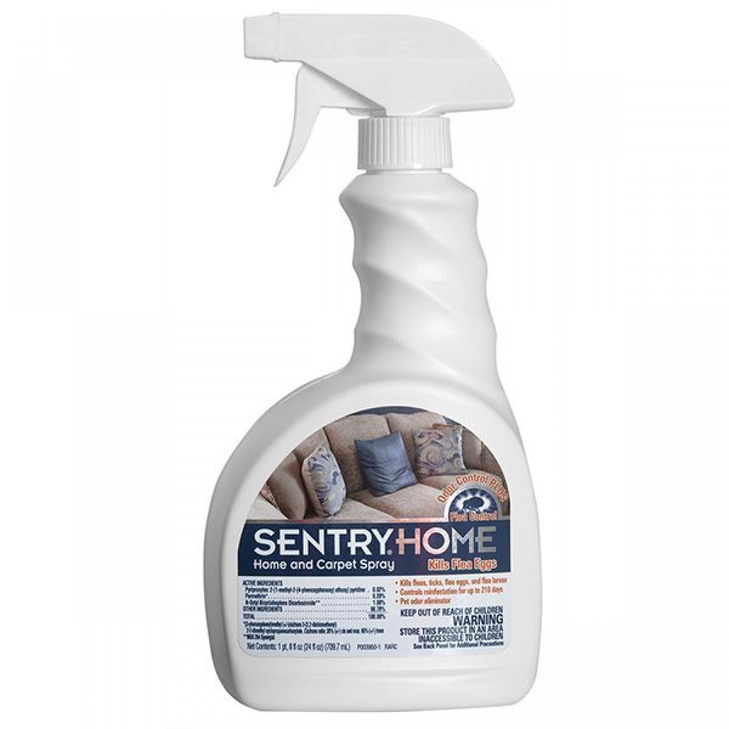 Спрей Sentry Home – подвійний удар по паразитах! Він вбиває кліщів, бліх, яйця та личинки бліх і продовжує працювати, запобігаючи повторному зараженню комахами протягом 7 місяців.