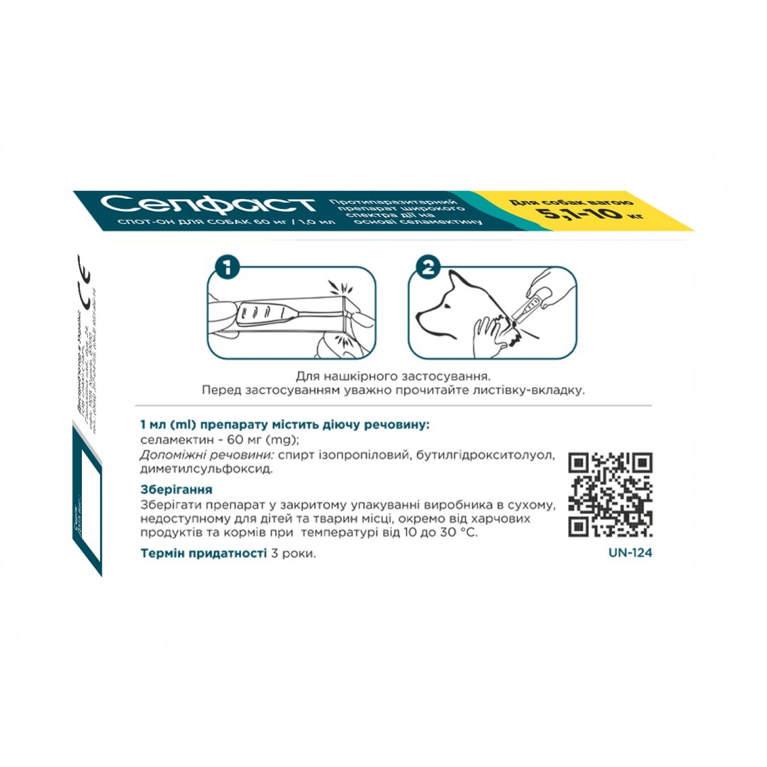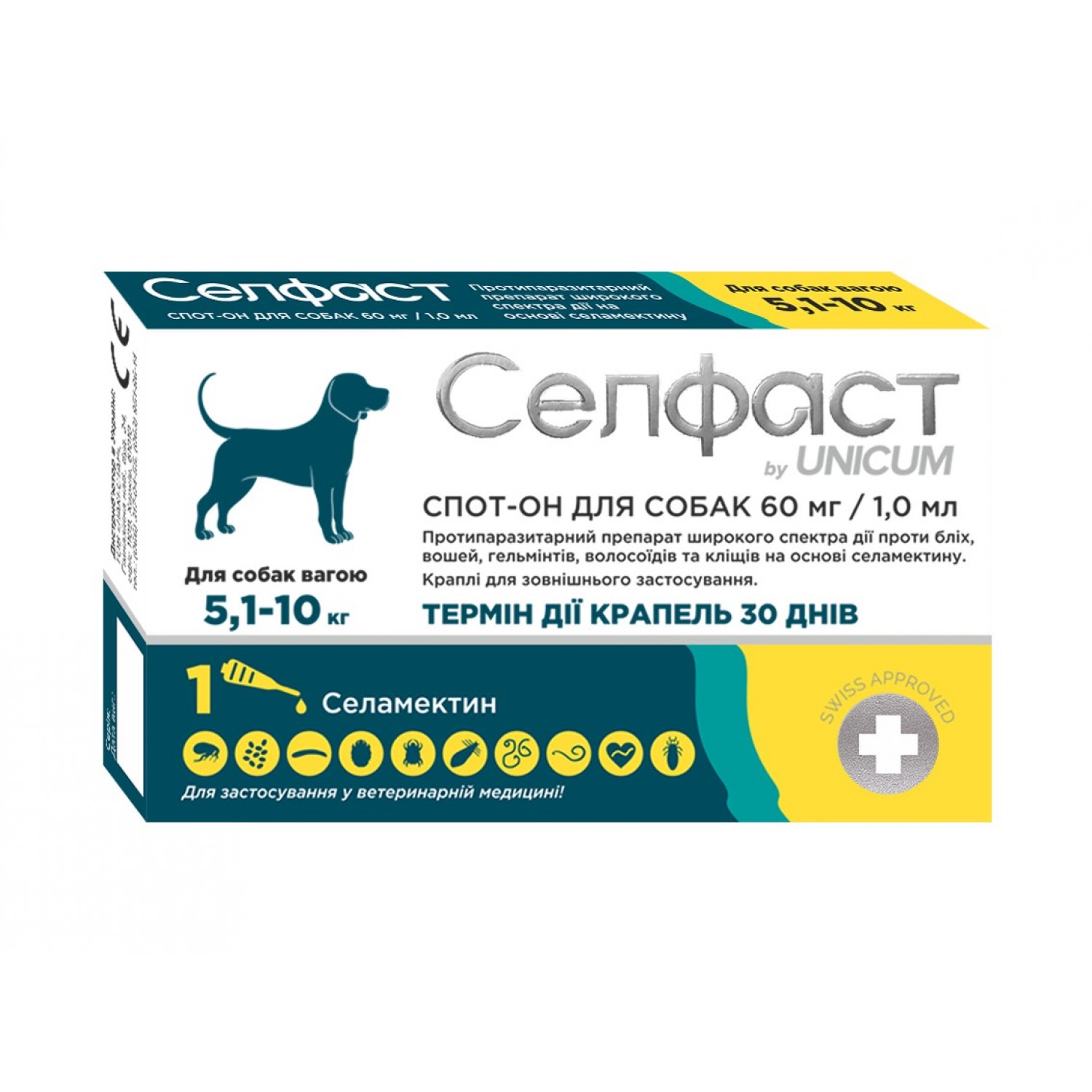 Unicum Селфаст краплі на холку від бліх, кліщів та гельмінтів для собак 5,1-10 кг (селамектин)