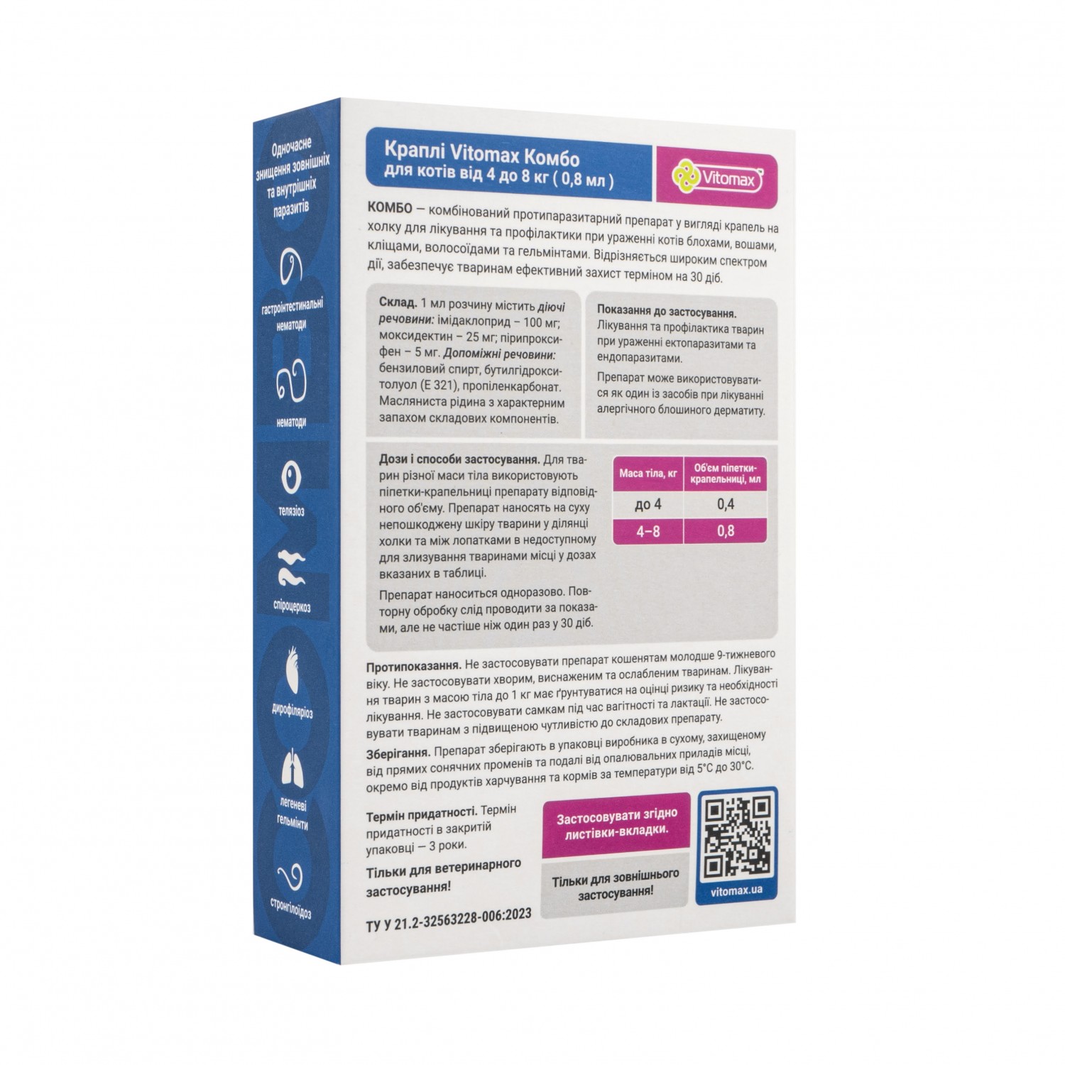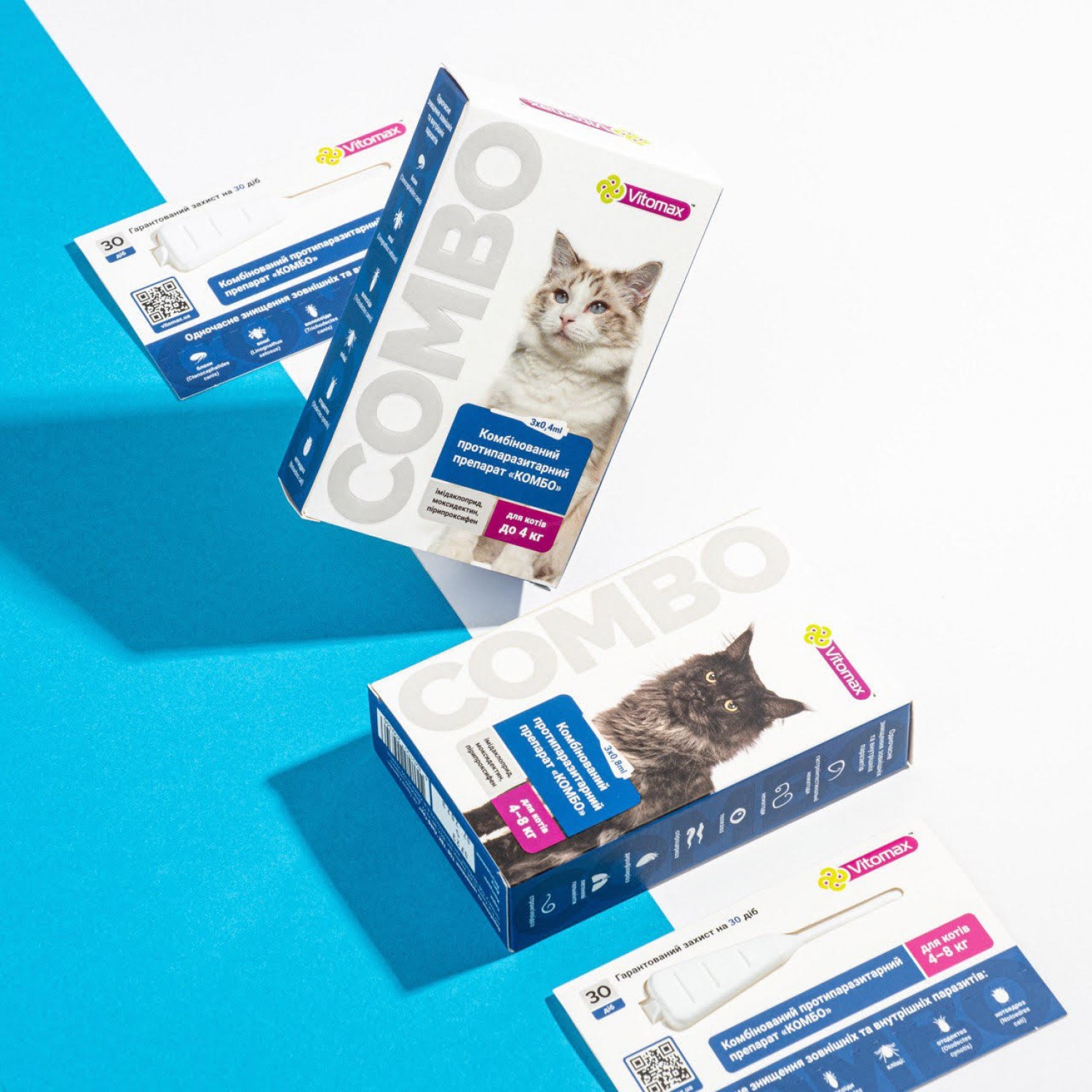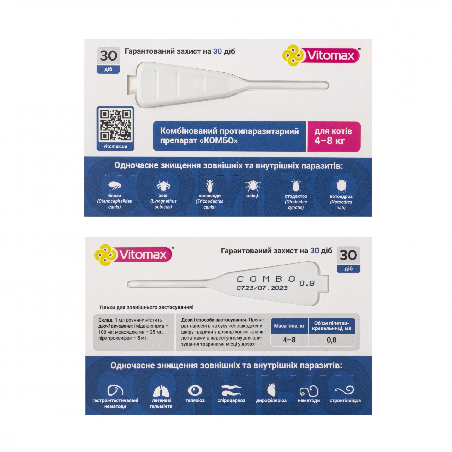 Краплі Vitomax Combo для котів від 4 до 8 кг - це ендо та екто-паразитицид місцевого застосування. Застосовуються для профілактики та лікування тварин при ураженні блохами, вошами, волосоїдами, кліщами, нематодами дихальних шляхів та гастроінтестинальними нематодами. Використовують у комплексній терапії при лікуванні алергічного блошиного дерматиту.