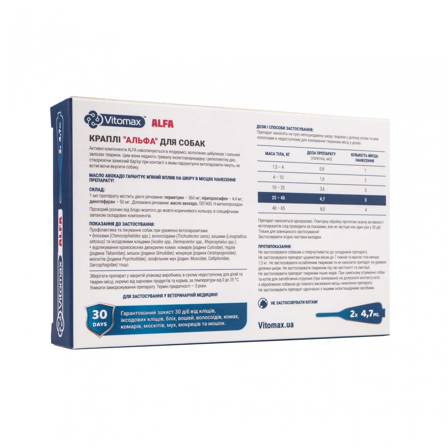 Гарантований захист від кліщів, іксодових кліщів, бліх, вошей, волосоїдів, комах, комарів, мух, мокриць і мошок.