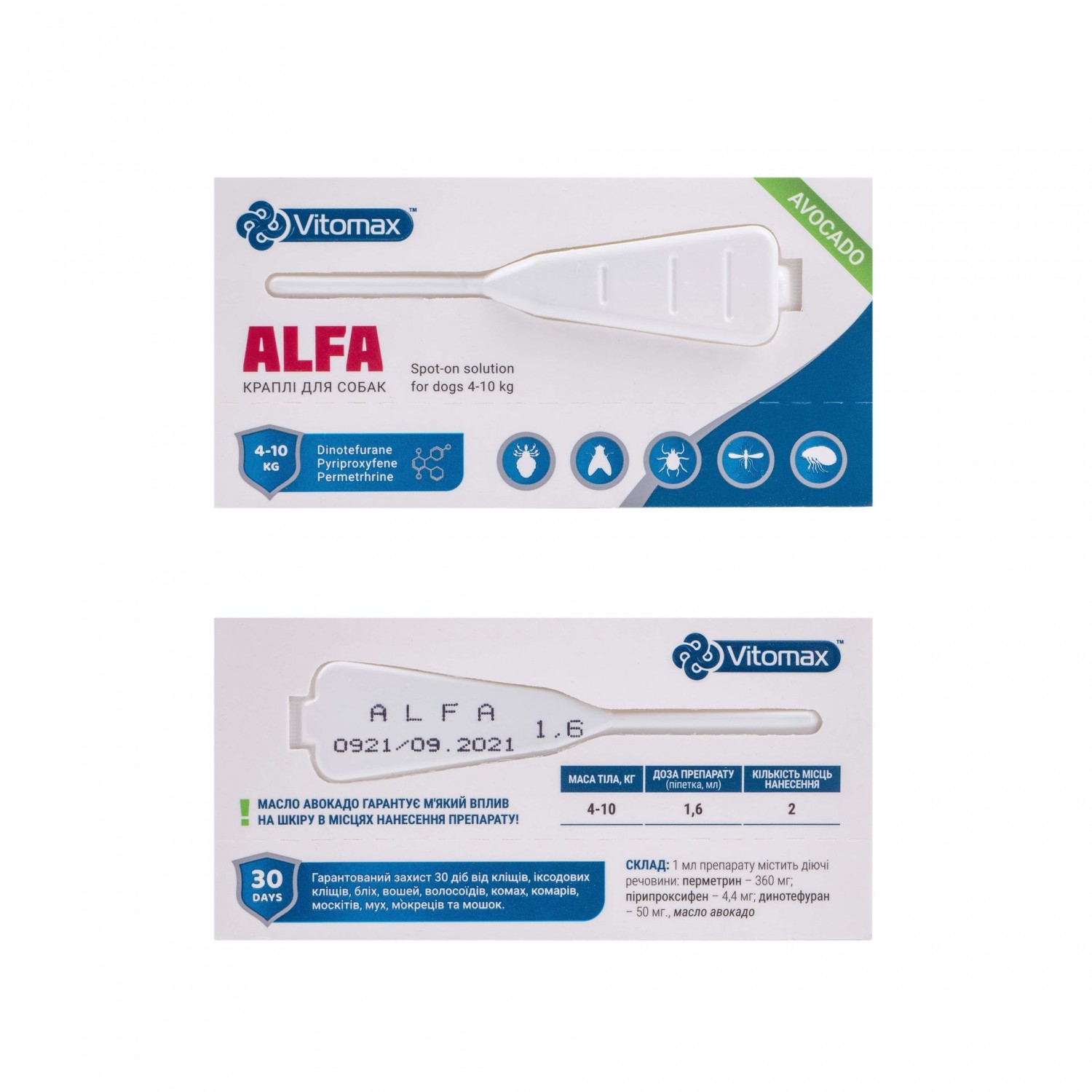 Гарантований захист від кліщів, іксодових кліщів, бліх, вошей, волосоїдів, комах, комарів, мух, мокриць і мошок.