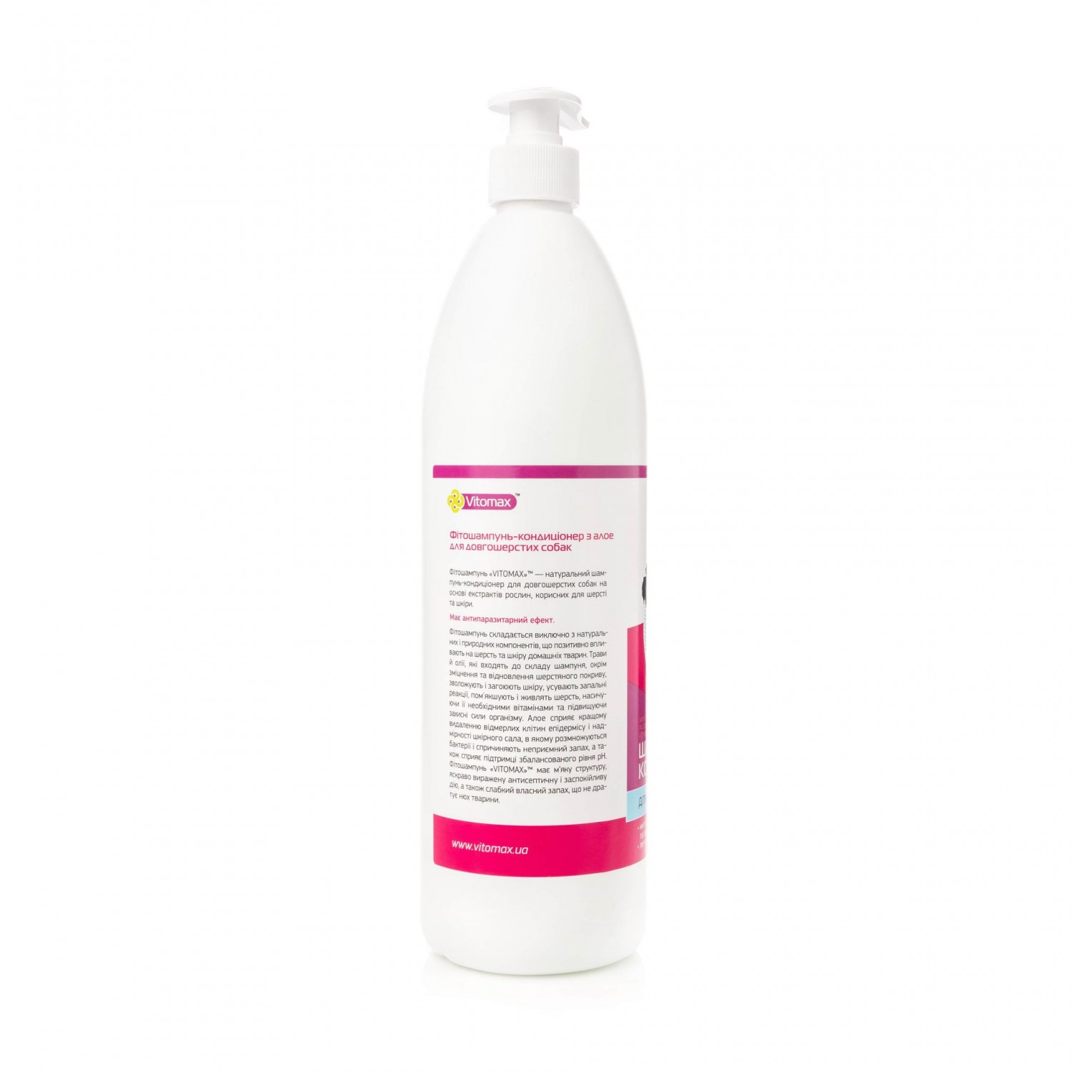 Фітошампунь ТМ Vitomax - натуральний шампунь-кондиціонер для довгошерстих собак на основі екстрактів рослин, корисних для шкіри та шерсті. Має протипаразитарний ефект. Фітошампунь складається виключно з натуральних та природних компонентів, які позитивно впливають на шерсть та шкіру домашньої тварини.
