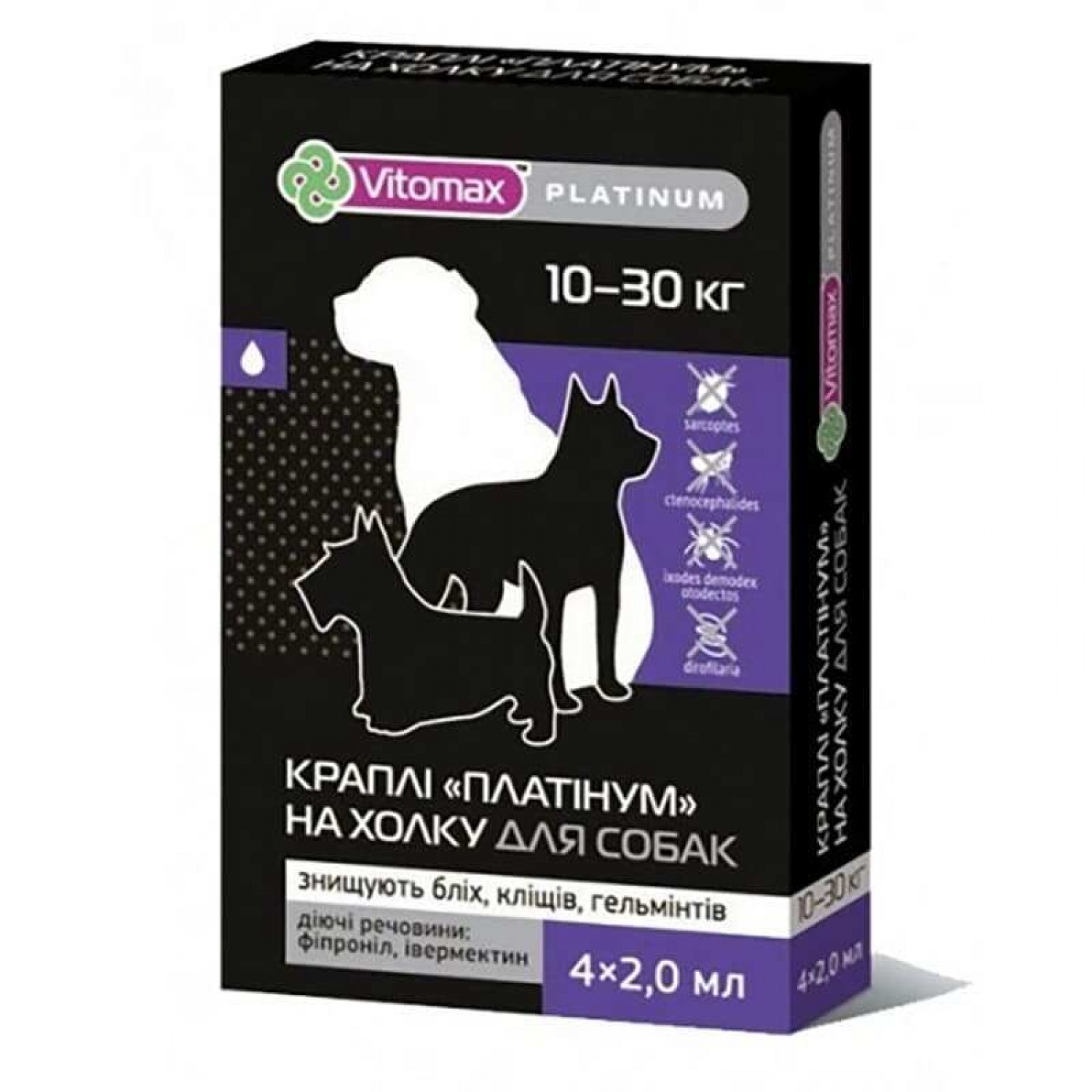 Інсектицидноакарицидний препарат розроблено спеціально для собак великих порід, вагою 10-30 кг. Лінійка протипаразитарних крапель «Платінум» призначена для лікування або профілактики зараження паразитами.